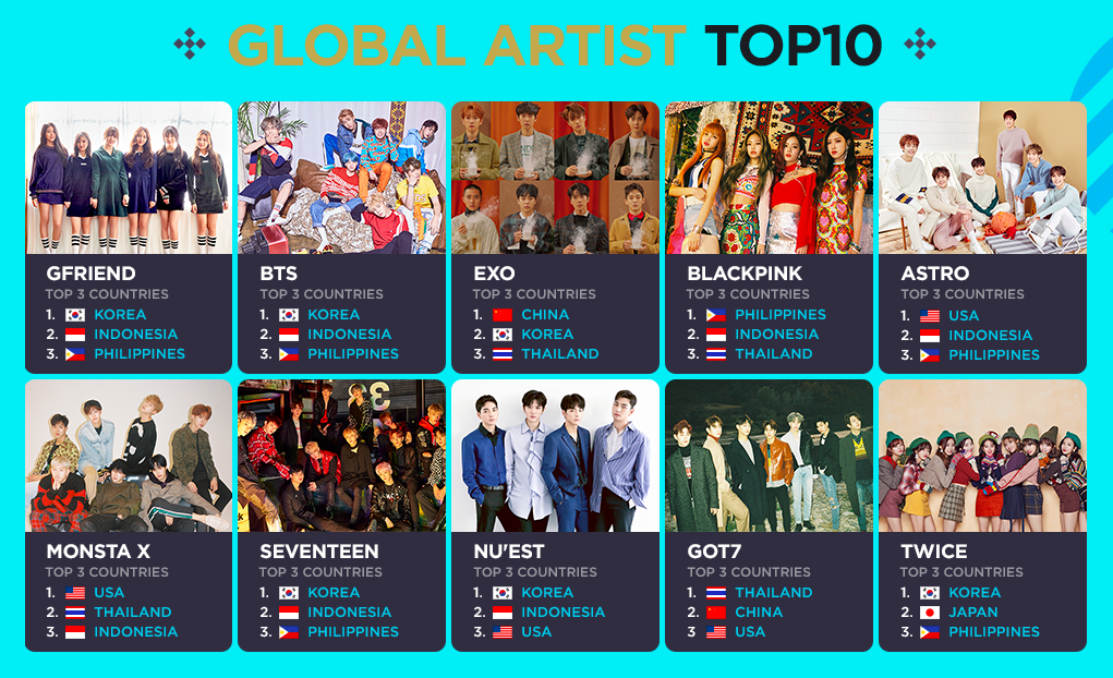 Notez que les 10 artistes ne sont pas classés entre eux, mais simplement mis tous sur le même podium. On y retrouve donc ASTRO, BLACKPINK, BTS, EXO, GFRIEND, GOT7, MONSTA X, NU’EST, SEVENTEEN et TWICE. En-dessous de chaque groupe, vous pouvez notamment voir le top 3 des pays dans lequel le groupe a été le plus soutenu.