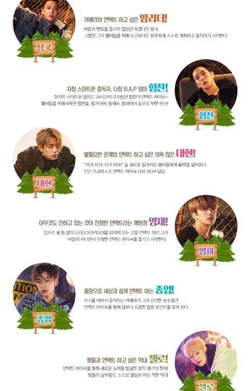 Une introduction des membres a également été donné. Yongguk montrera ses qualités de leader, Himchan qui ne peut pas se passer de téléphone se transformera en Him-Gyver, Daehyun montrera de l’enthousiasme face à ces nouvelles choses, Youngjae sera toujours actifs, Jongup y trouvera un effet de bien-être et Zelo se découvrira de nouveaux talents :