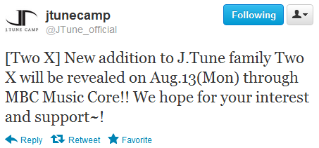Toutefois, l’agence a révélé que Two X devrait faire leur première apparition le 13 Août prochain pendant le pré-enregistrement du Music Core MBC. Ce sera considéré comme leur première apparition télé. Ils profiteront d’un special stage tourné à Sokcho Cheongchoho Expo pour réalisé là-bas l’enregistrement du Music Core qui aura lieu quelques jours plus tôt.