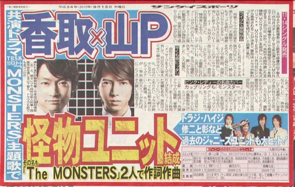 Shingo Katori de SMAP et Yamapi vont former une nouvelle unit à l’occasion de la sortie de leur nouveau drama ‘Monsters’. En effet, les deux chanteurs tiendront les rôles principaux de ce nouveau drama et pour fêter ça, ils sortiront une musique ensemble sous le pseudonyme de ‘The MONSTERS’. Le single sortira le 15 novembre prochain. Voici une preview :