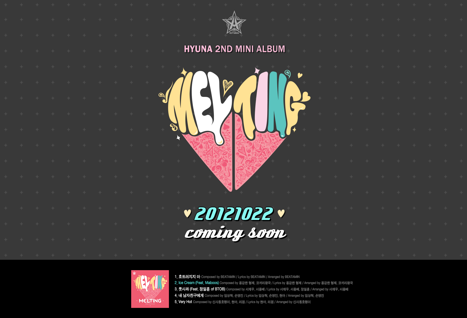 Hyuna reviendra avec un second mini-album le 22 octobre prochain qui mettra en vedette la chanson ‘Ice Cream’, qui est décrite comme une piste hip hop avec un puissant son produit par les Brave Brothers. Voici la tracklist :