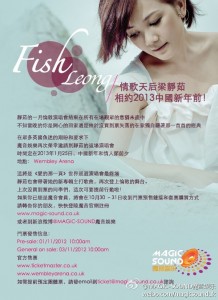 Encore un nouveau concert asiatique à Londres ! En effet, la nouvelle tournée de Fish Leong, Fish – Love Library World Tour 2013, passera  à la célèbre Wembley Arena de Londres le 25 janvier 2013 !  Pour les personnes qui sont intéressées, les billets seront en vente à partir le 3 novembre et coûteront  entre 40 et 174 euros environ.