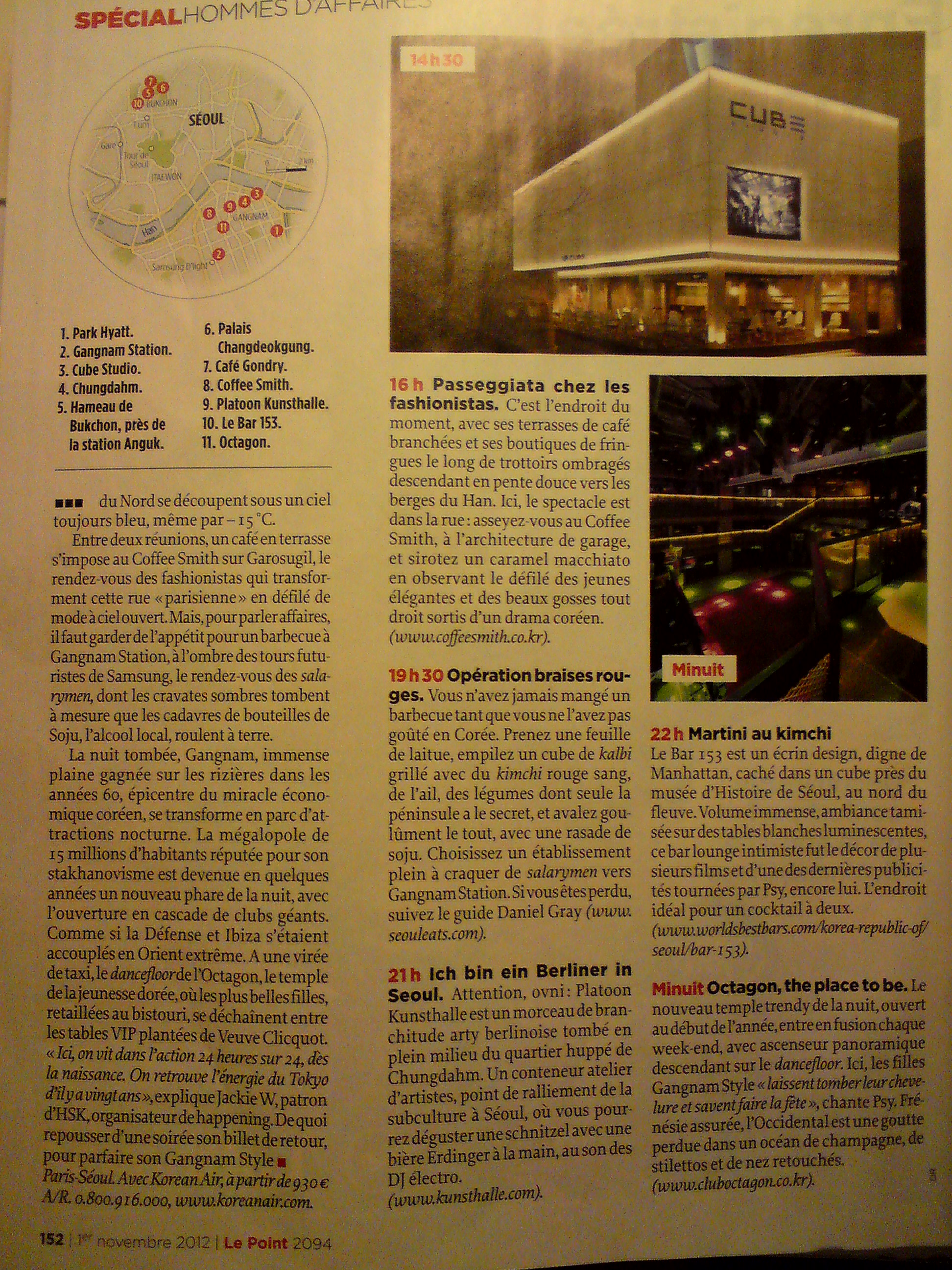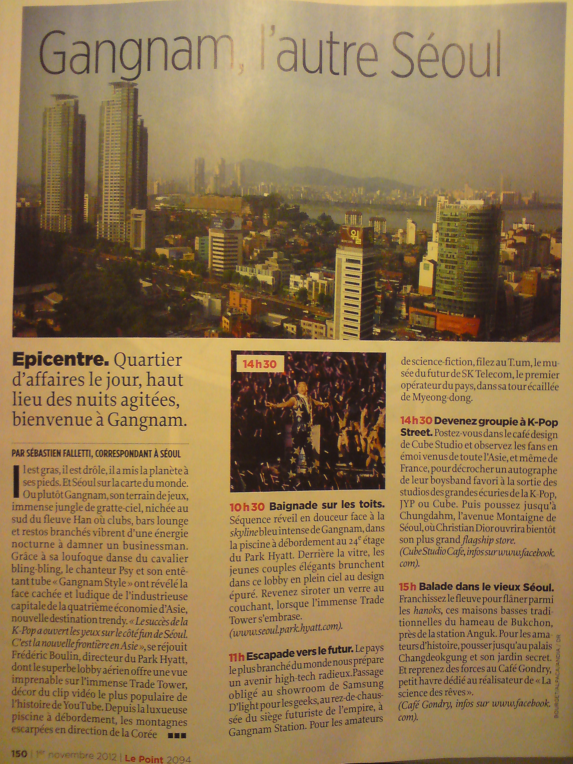 Le magazine hebdomadaire français Le Point vient de publier, dans son édition du 1er novembre, un article de deux pages sur le quartier de Séoul rendu populaire par Psy : Gangnam.