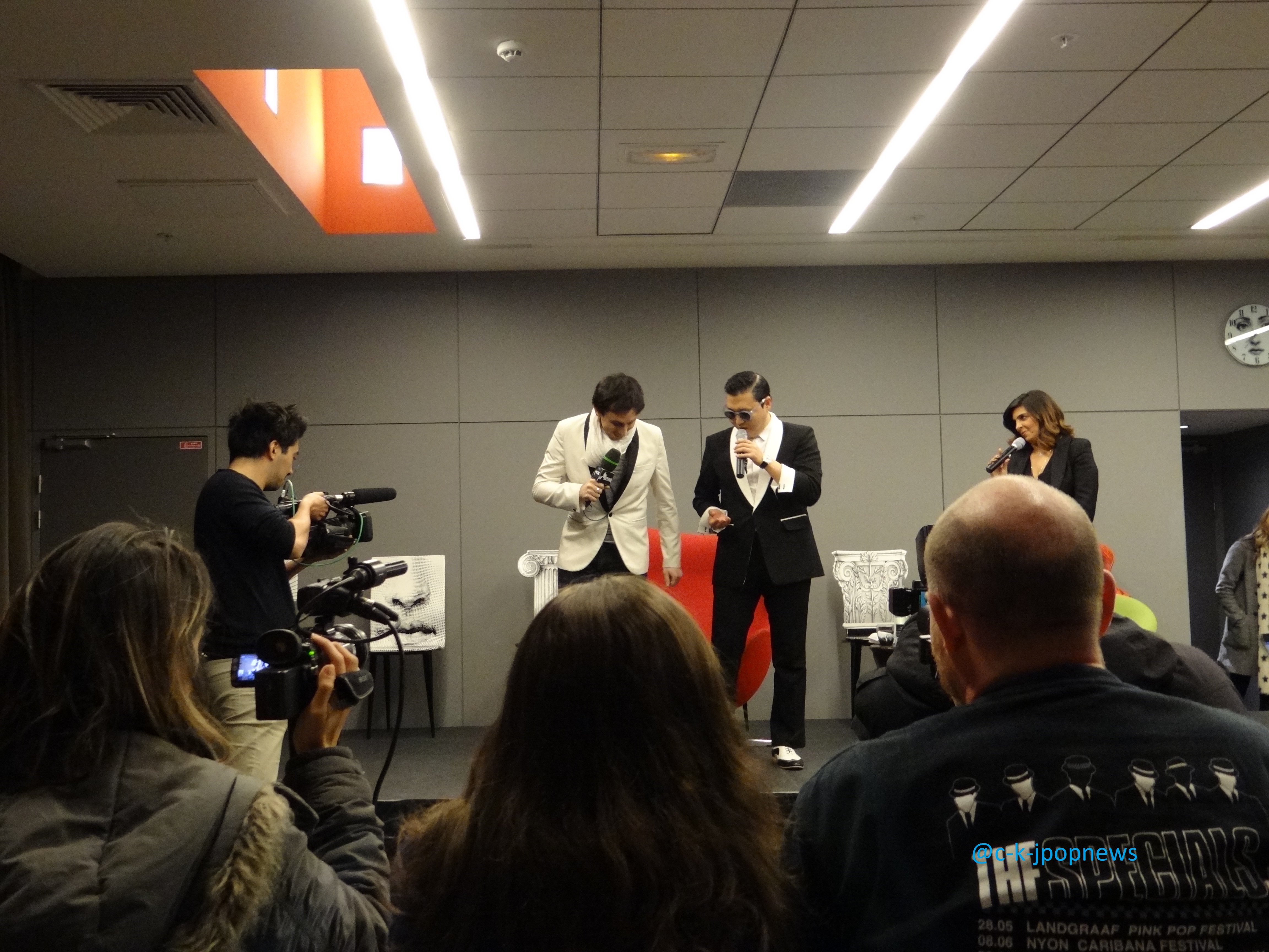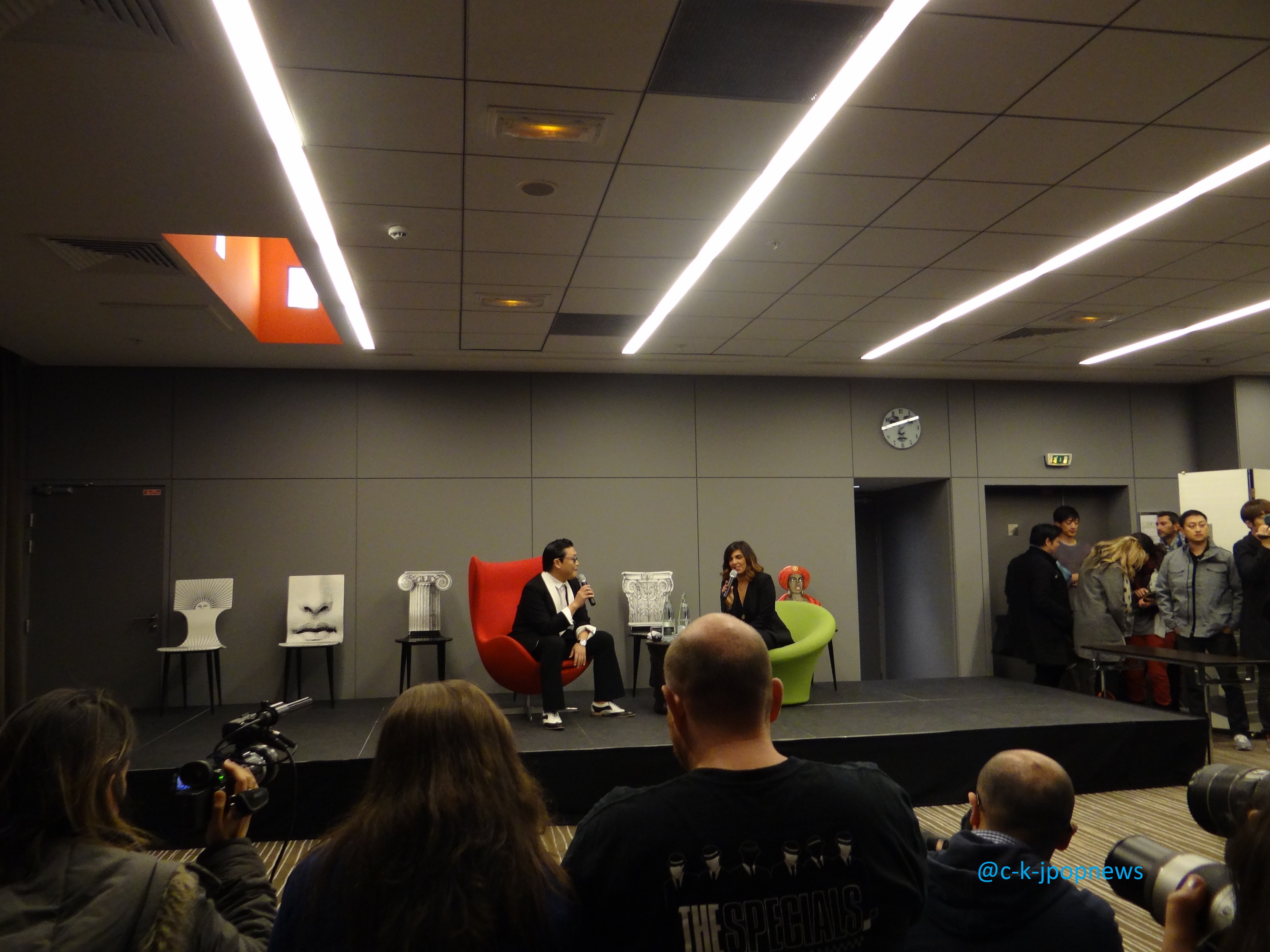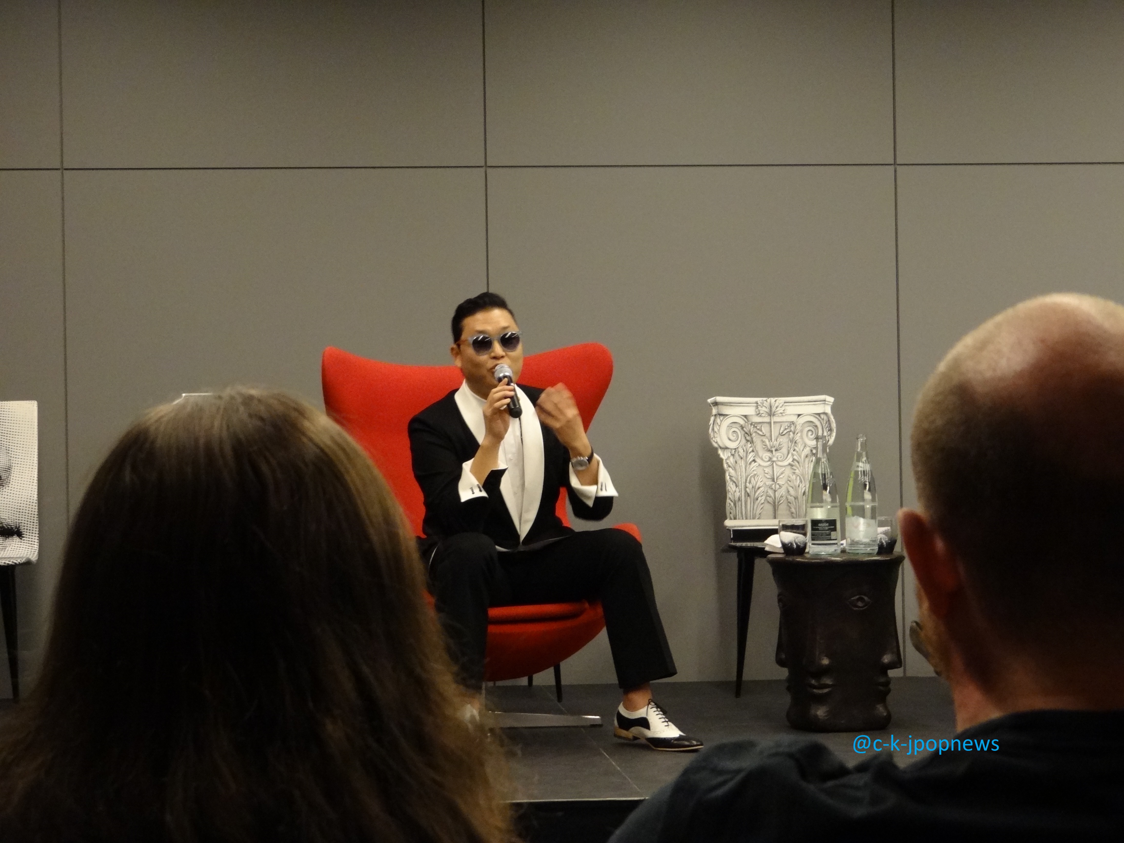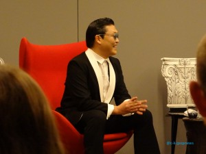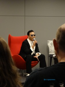Après s’être fait attendre pendant 40 min Psy est enfin arrivé! Il a d’abord commencé par se présenter : “J’ai vécu 5 ans aux États-Unis pour mes etudes et c’est là que j’ai commencé à écrire des chansons, une cinquantaine. Je voulais vraiment devenir compositeur alors j’ai essayé de le vendre à mon retour en Corée mais ça n’a pas marché” Il a aussi insisté sur le fait qu’il avait 12 ans de carrière derrière lui puis il est revenu sur le phénomène Gangnam Style.