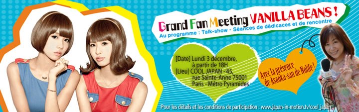 Par ailleurs, le groupe ira également à la rencontre de leurs fans parisiens à l’occasion d’un fan meeting organisé le lundi 3 décembre 2012 à partir de 18h. Celui-ci aura lieu dans le magasin COOL JAPAN situé rue St-Anne à Paris et sera animé par Suzuka de Nolife. Attention toutefois, seules 50 personnes pourront prendre part à cet évènement.