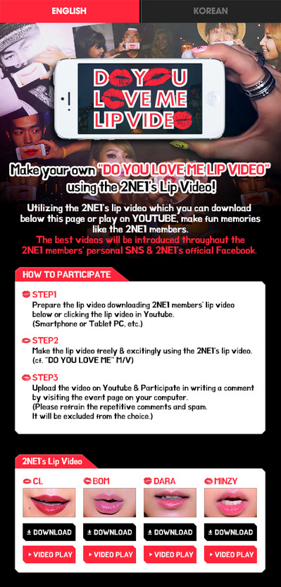 Un nouveau petit concours à vu le jour en suivant l’idée lancée par le dernier MV des 2NE1 Do You Love Me (Les fameuse scènes où les filles s’amusent avec leur téléphone portable et les vidéos des bouches xD). Et bien YG a décidé de publier ces 4 vidéos, une pour chaque membre avec leur bouche.
