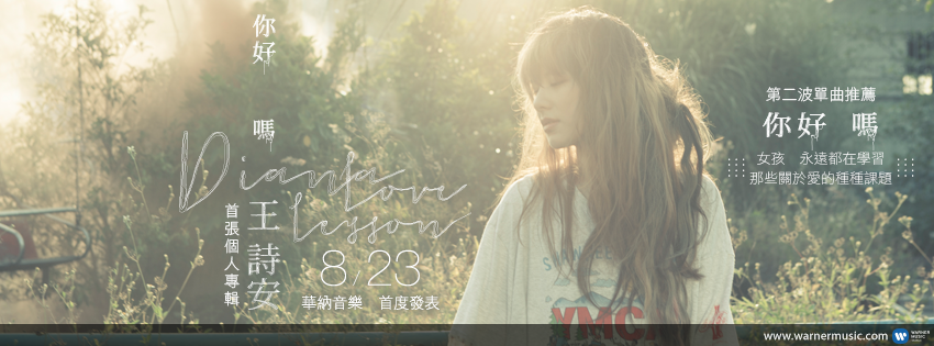 Diana Wang, qui prévoit de sortir son premier album single ‘Love Lesson’ chez warnertaiwan le 23 août, vient de révéler un nouveau clip vidéo. La chanson s’intitule 你好吗 et est donc le second extrait de son opus :