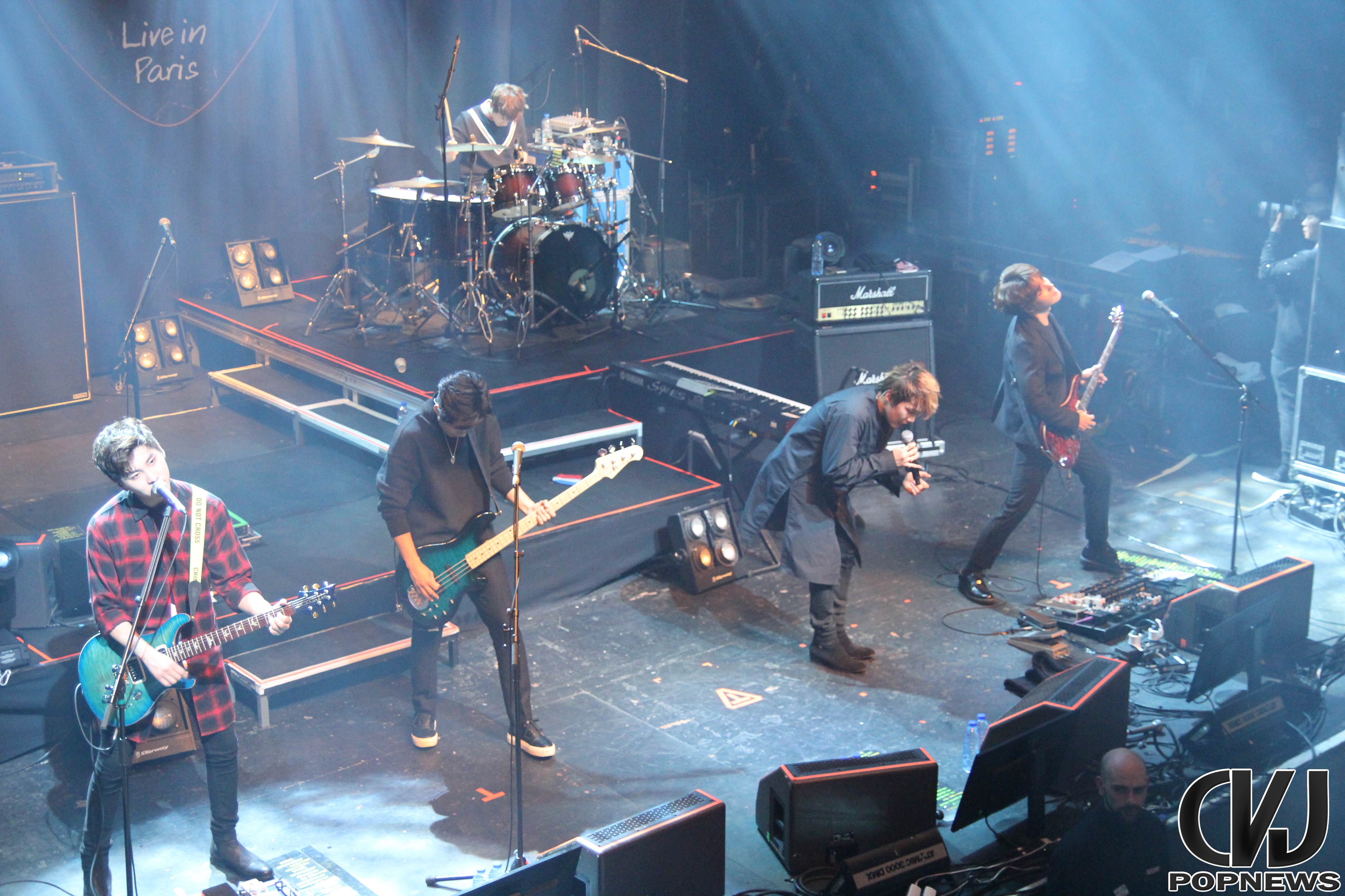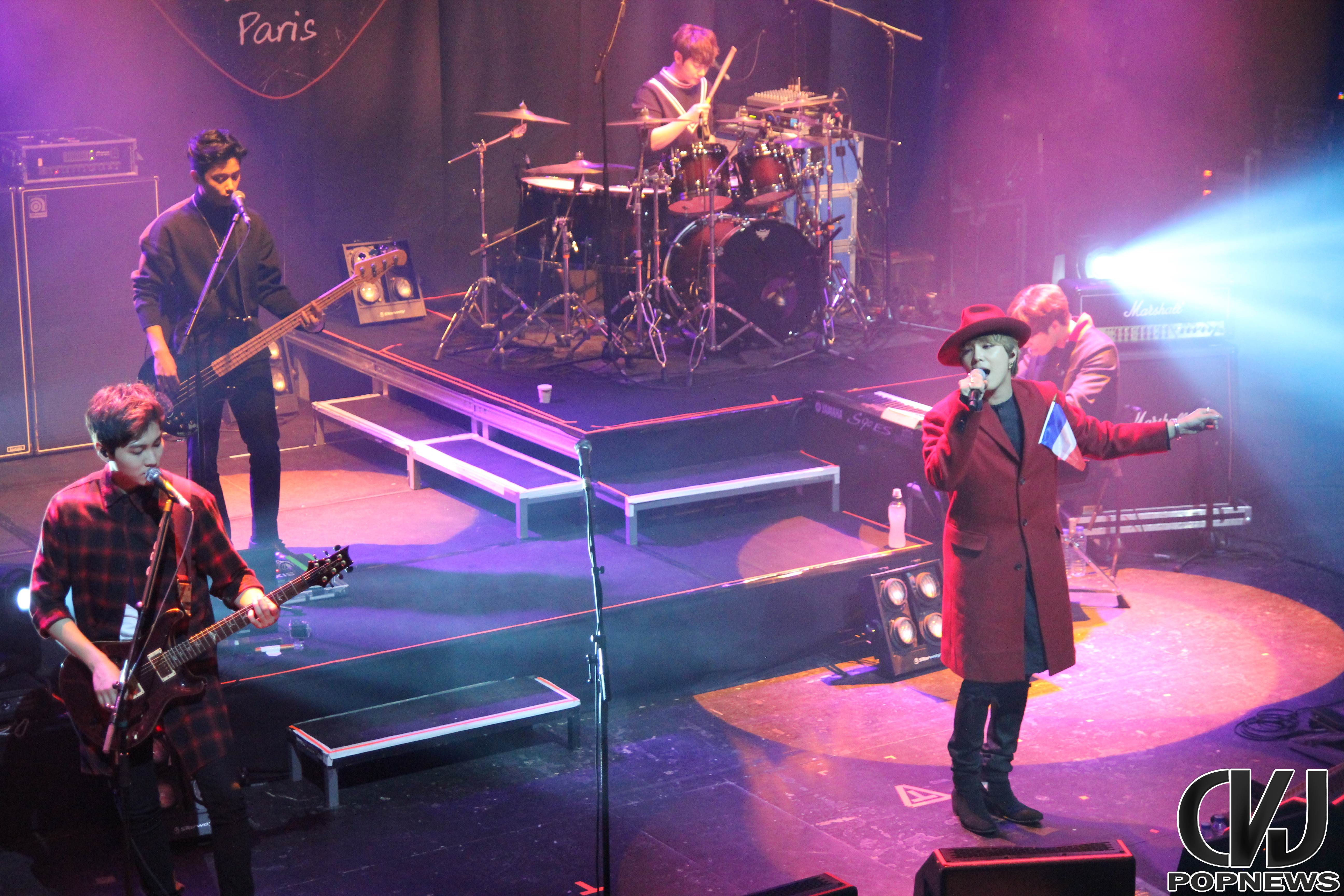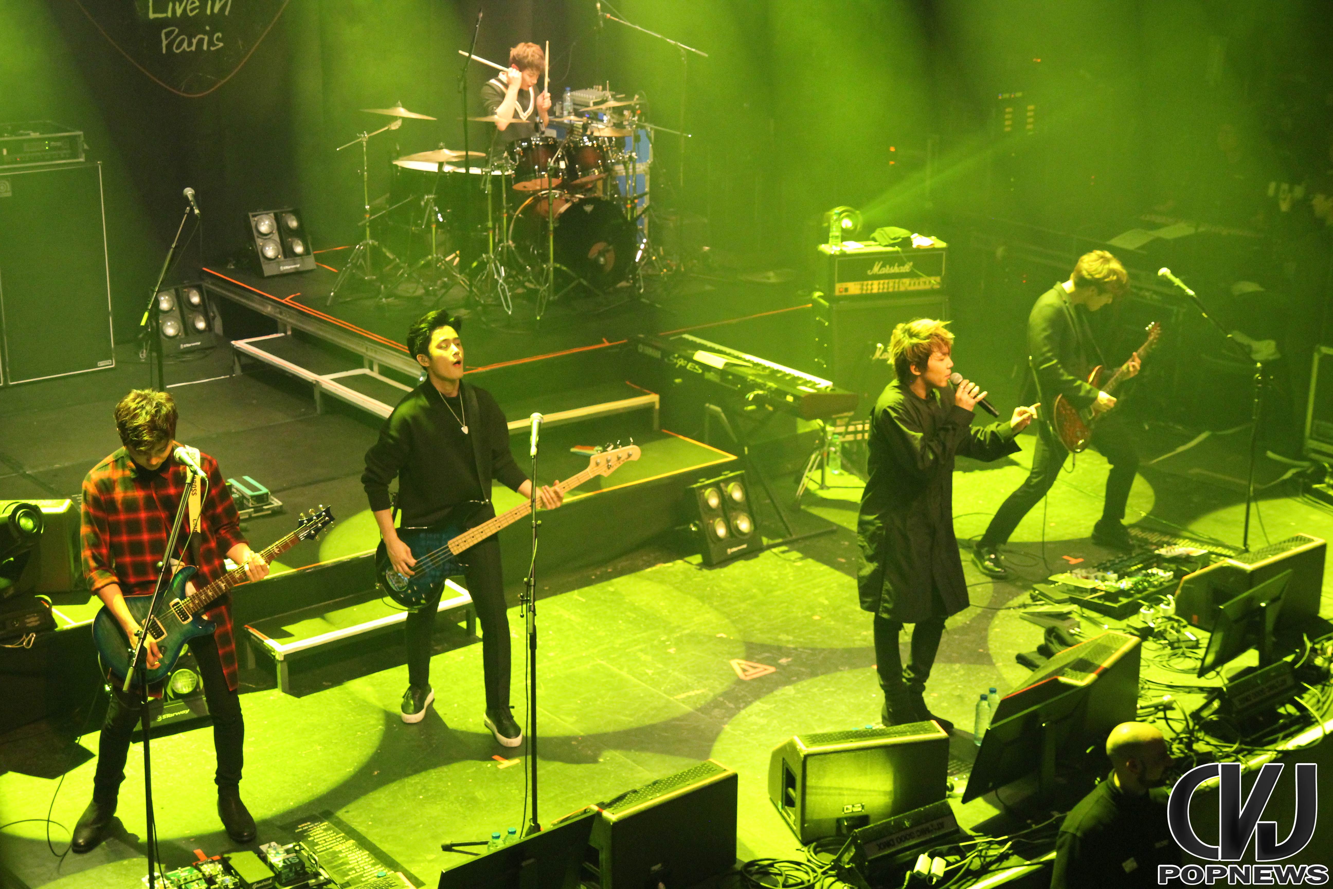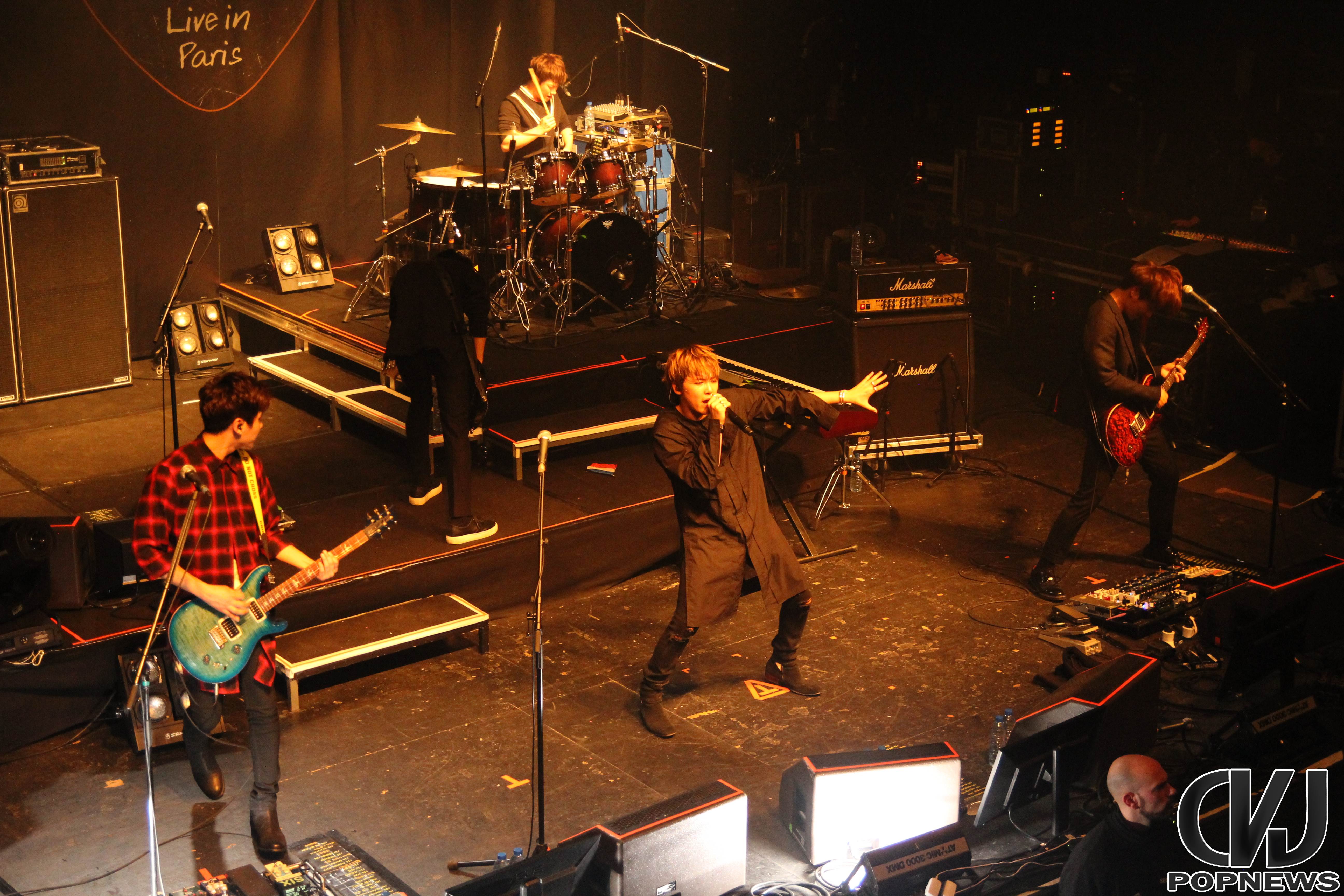 La salle se remplie doucement, jusqu’à ne laisser aucune place de libre et à 19h30 pile les lumières s’éteignent, le public cri et Jonghoon entre en scène. Le concert débute sur une intro au piano jouée par le leader du groupe. Les membres arrivent un à un et entre le concert avec la chanson Last Love Song. Hongki, portant un petit drapeau aux couleurs de la France, enflamma instantanément la scène.