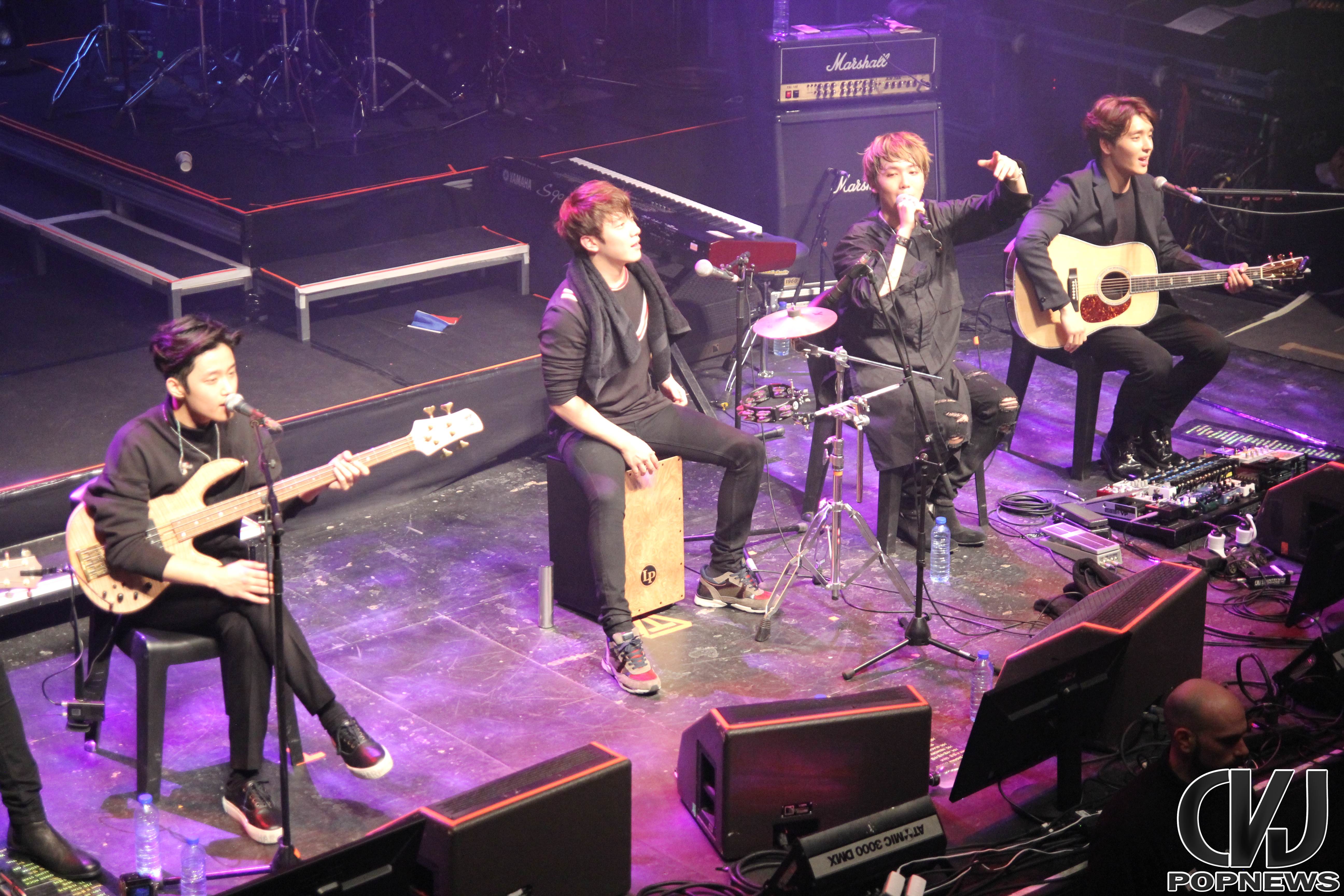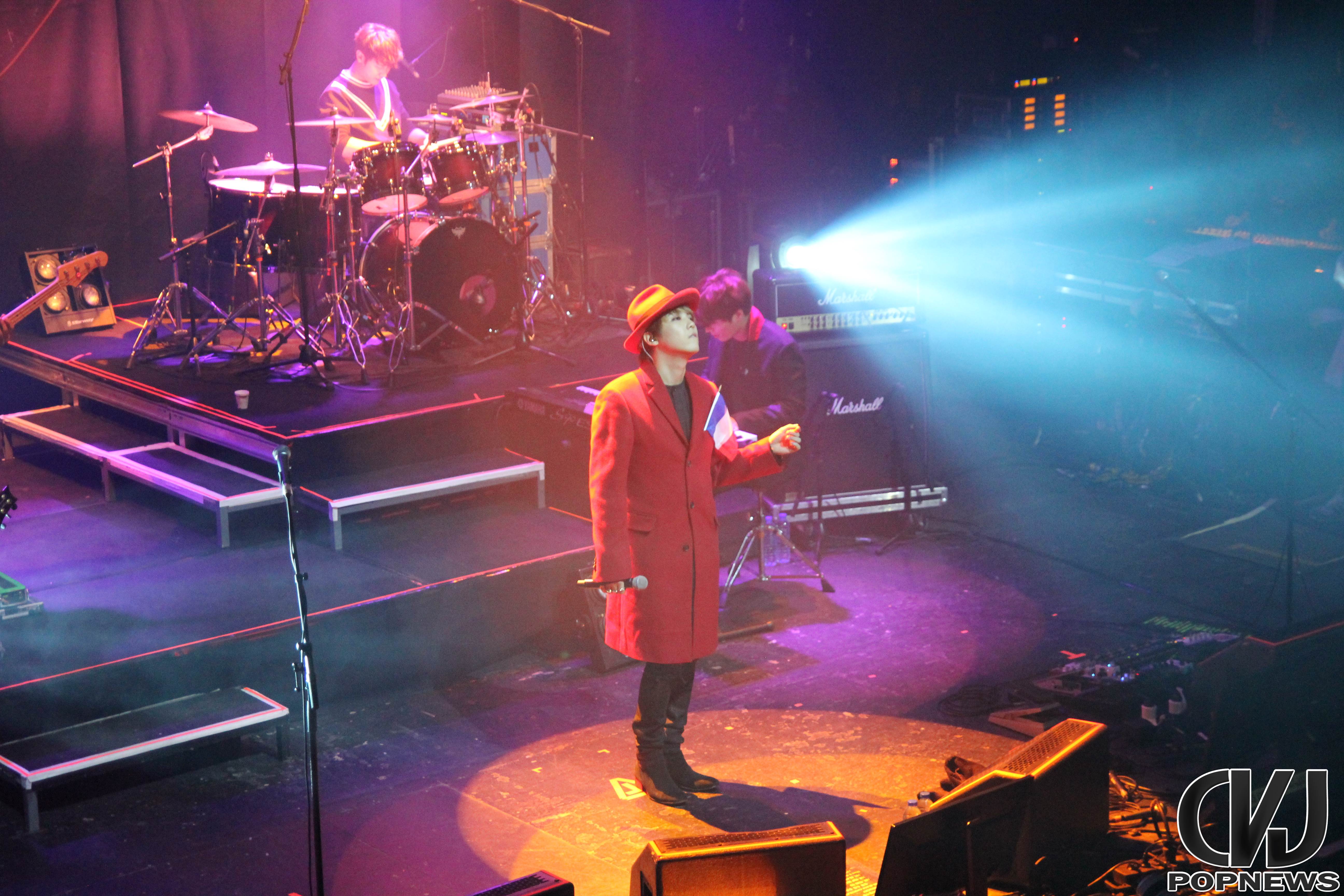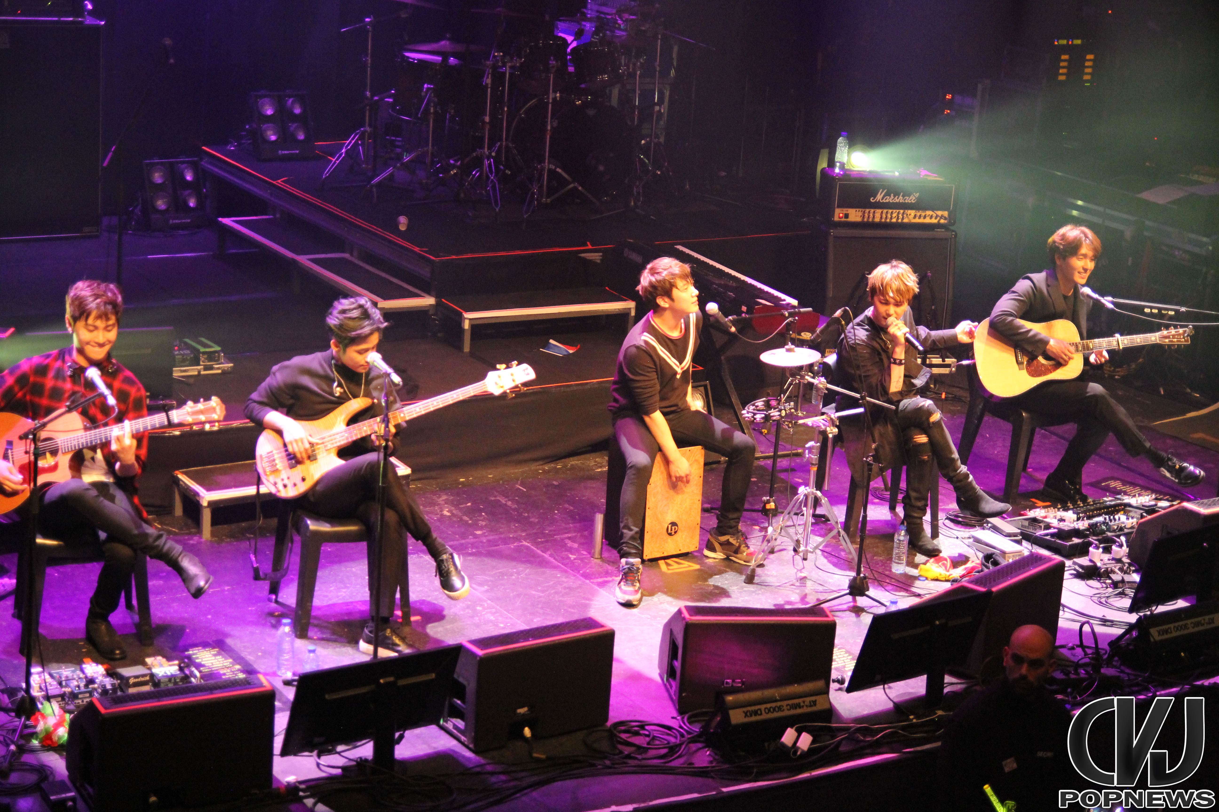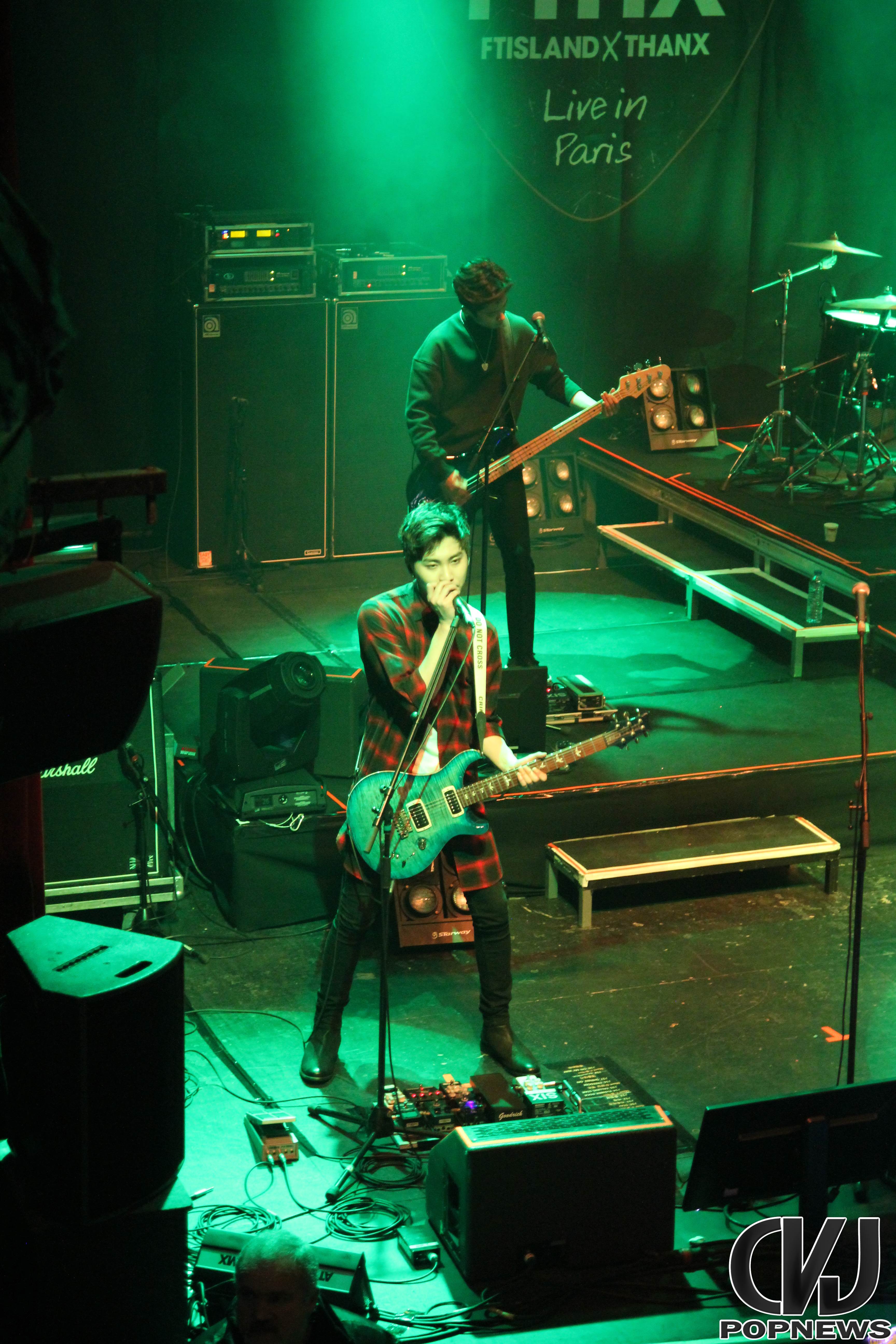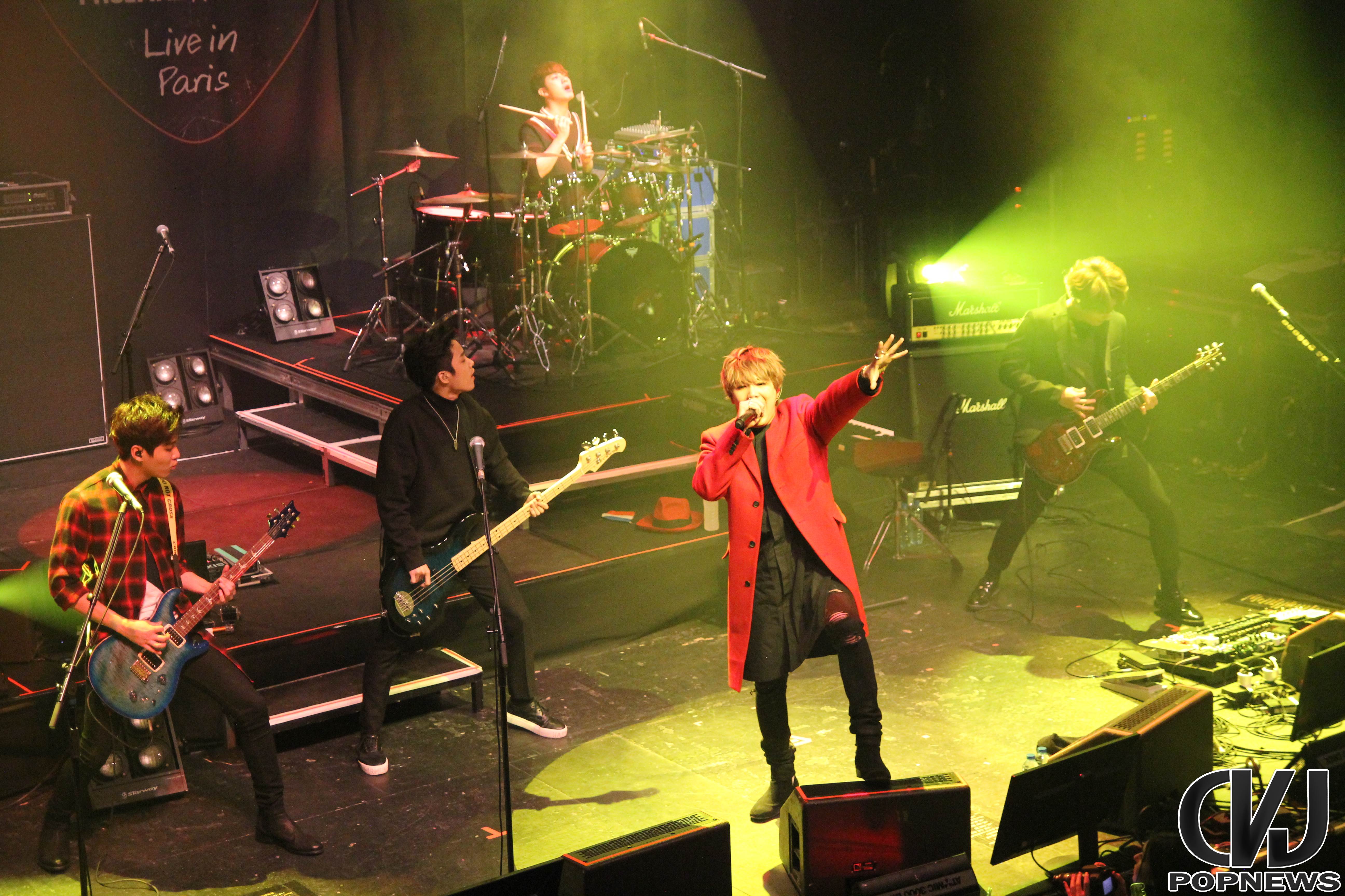 La salle se remplie doucement, jusqu’à ne laisser aucune place de libre et à 19h30 pile les lumières s’éteignent, le public cri et Jonghoon entre en scène. Le concert débute sur une intro au piano jouée par le leader du groupe. Les membres arrivent un à un et entre le concert avec la chanson Last Love Song. Hongki, portant un petit drapeau aux couleurs de la France, enflamma instantanément la scène.