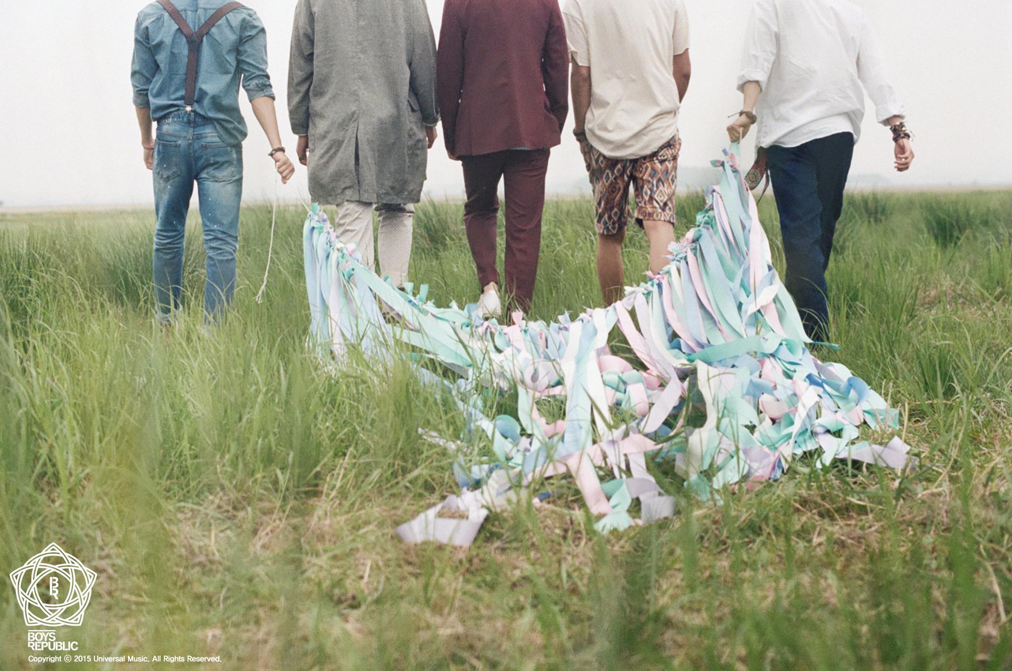 Cette image teaser est très simple et montre les membres du groupe marchant dans l’herbe, avec des vêtements confortables. Les 2 membres sur les côtés tiennent un fil auquel sont accrochées des bandes de tissus colorées.