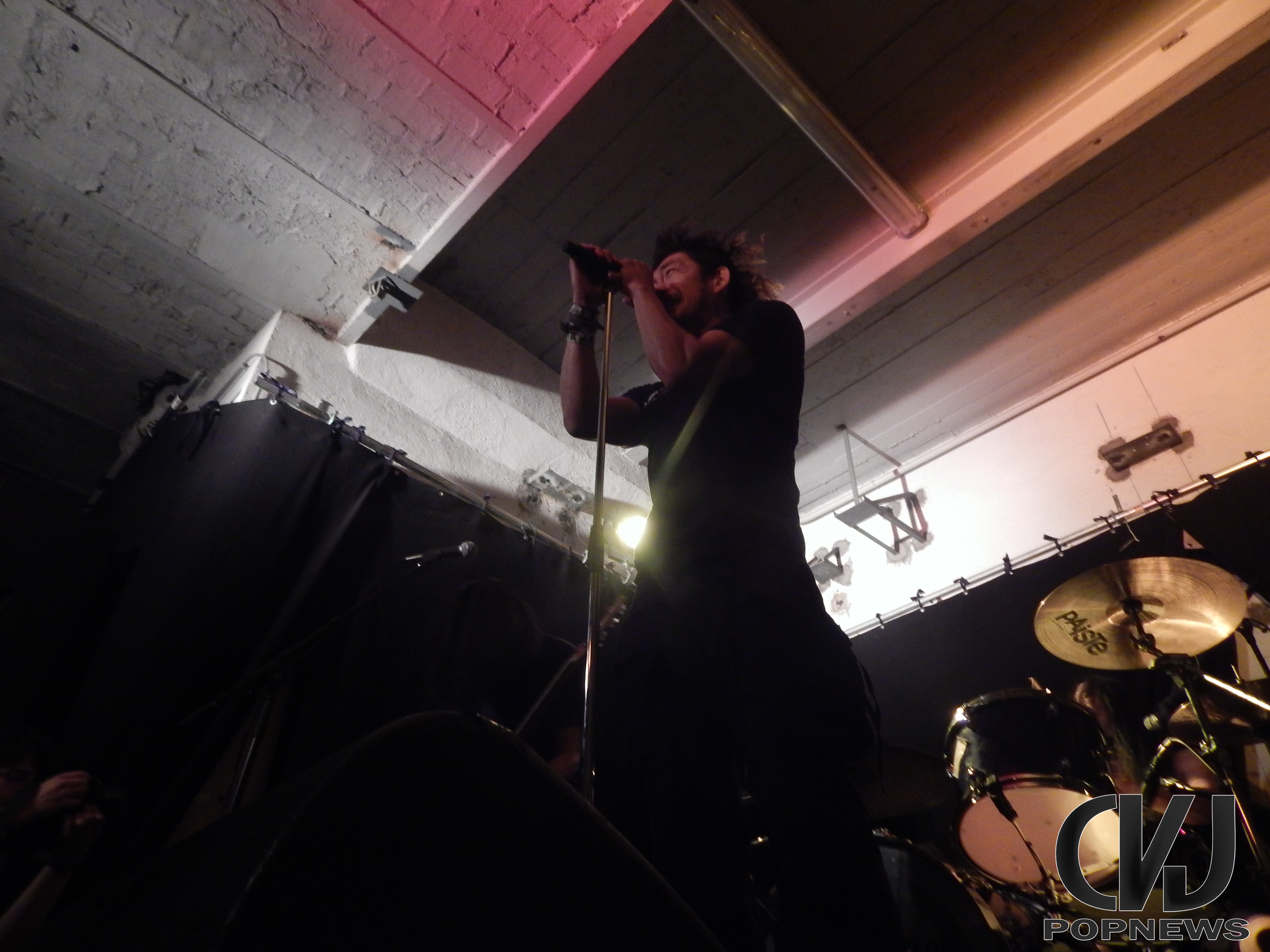 Tous les membres du groupe sont montés sur scène pour finir d’installer leur matériel et d’accorder leurs instruments. Seul le chanteur Toshi-Low est resté devant la scène, prêt à y monter au moment venu. L’introduction musicale avait un aspect religieux (musique traditionnelle japonaise ? Je ne sais pas exactement). Au moment où la première chanson commence, il bondit sur scène, déjà très concentré dans la musique !