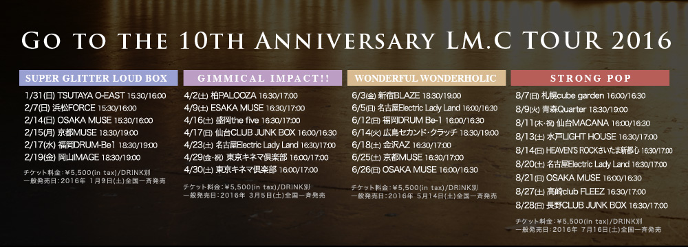 Par ailleurs, une tournée anniversaire nationale s’étalant sur de fin janvier jusqu’au mois d’août a été annoncée. La tournée se divise en quatre parties, chacune d’entre elle portant le nom d’un des albums du groupe, à savoir ‘Super Glitter Loud Box‘, ‘Gimmical Impact‘, ‘Wonderful Wonderholic‘ et ‘Strong Pop‘ :