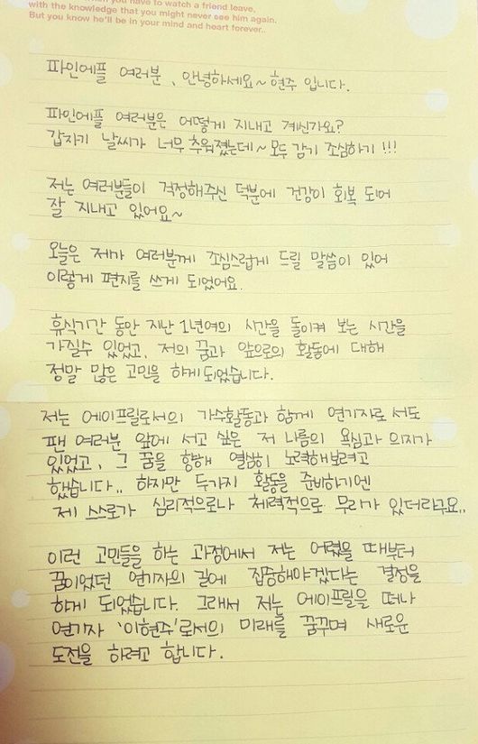 Home Corée du Sud Hyunjoo (APRIL) annonce son départ du groupe avec une lettre manuscrite