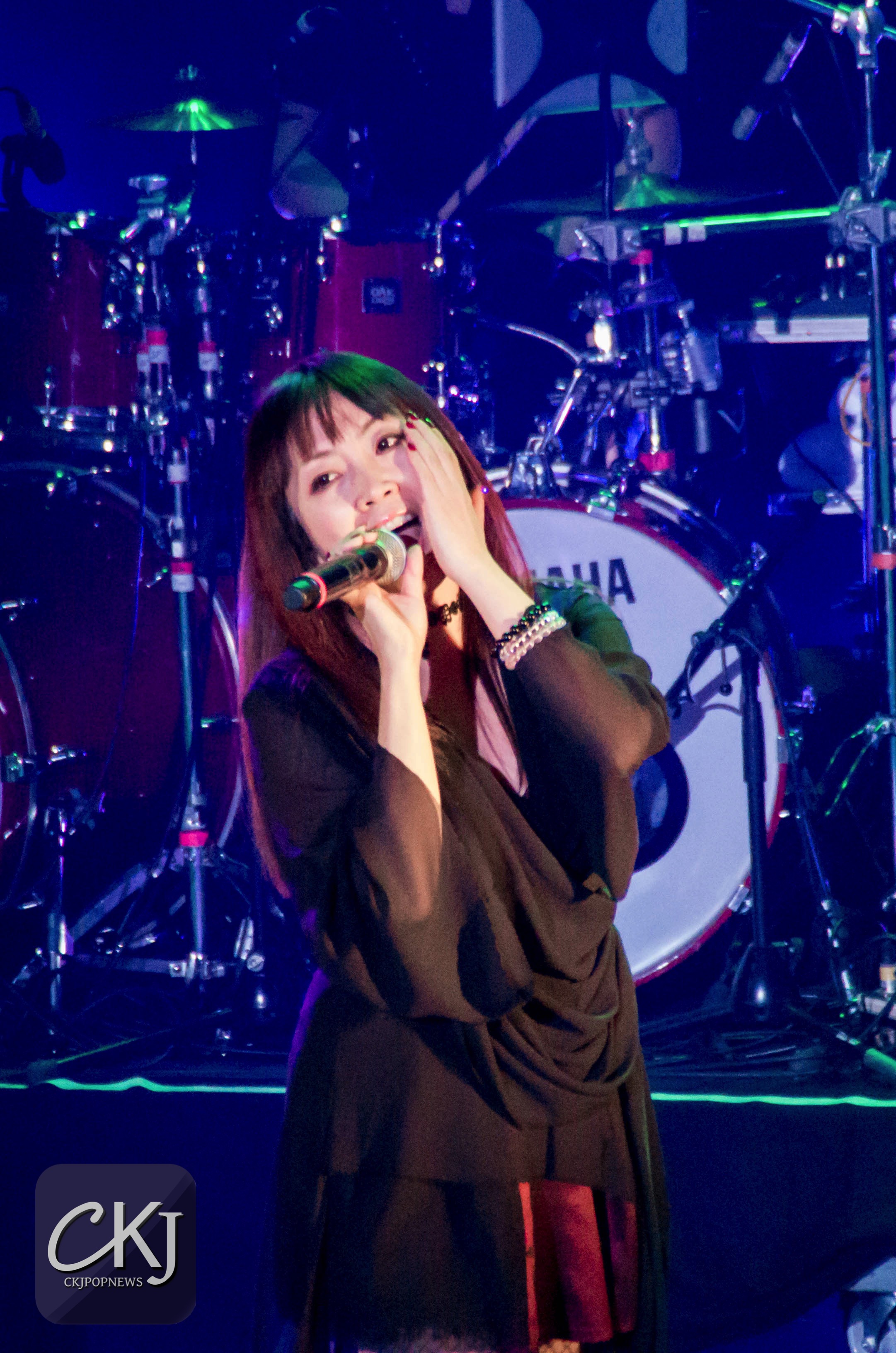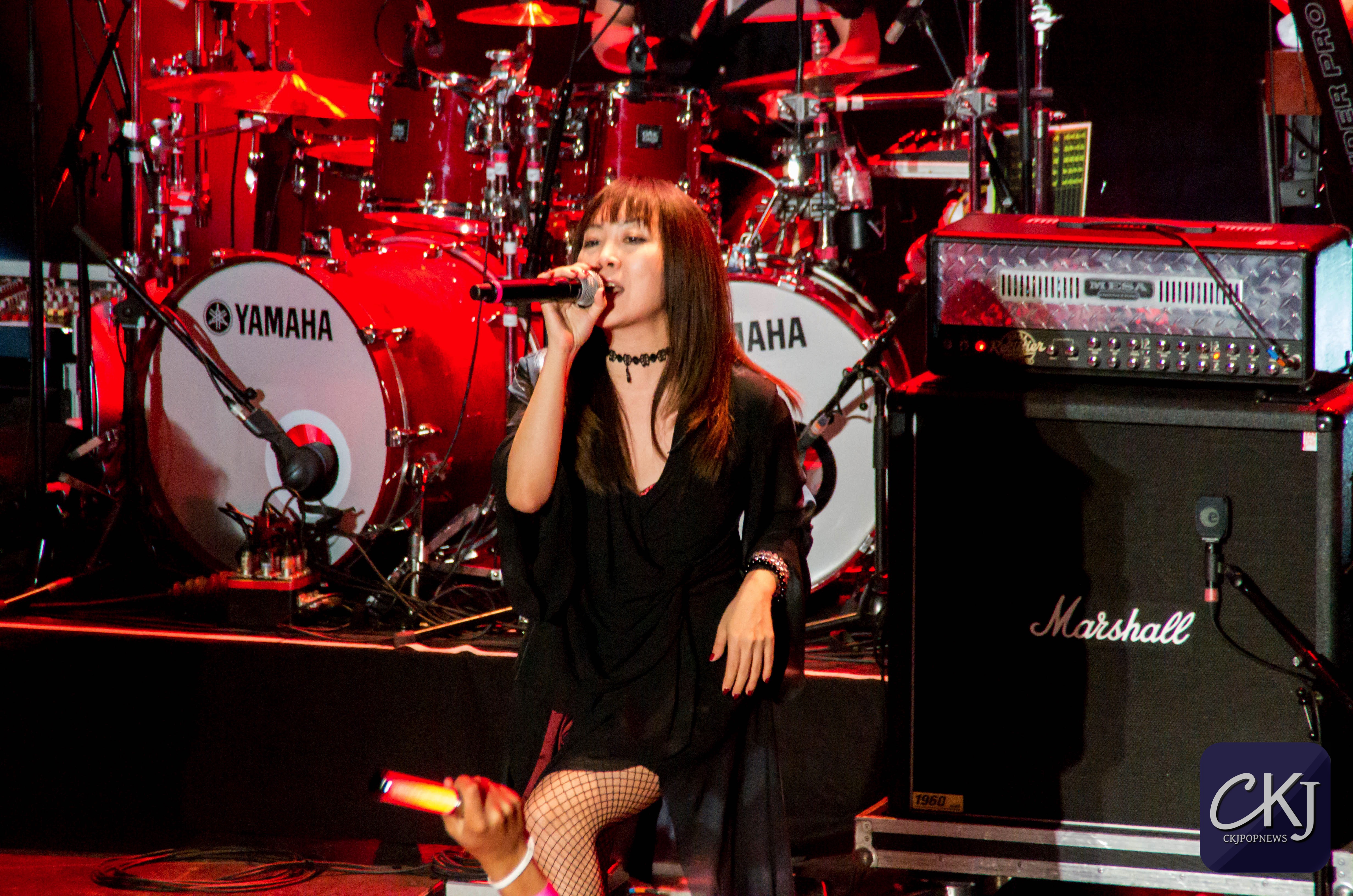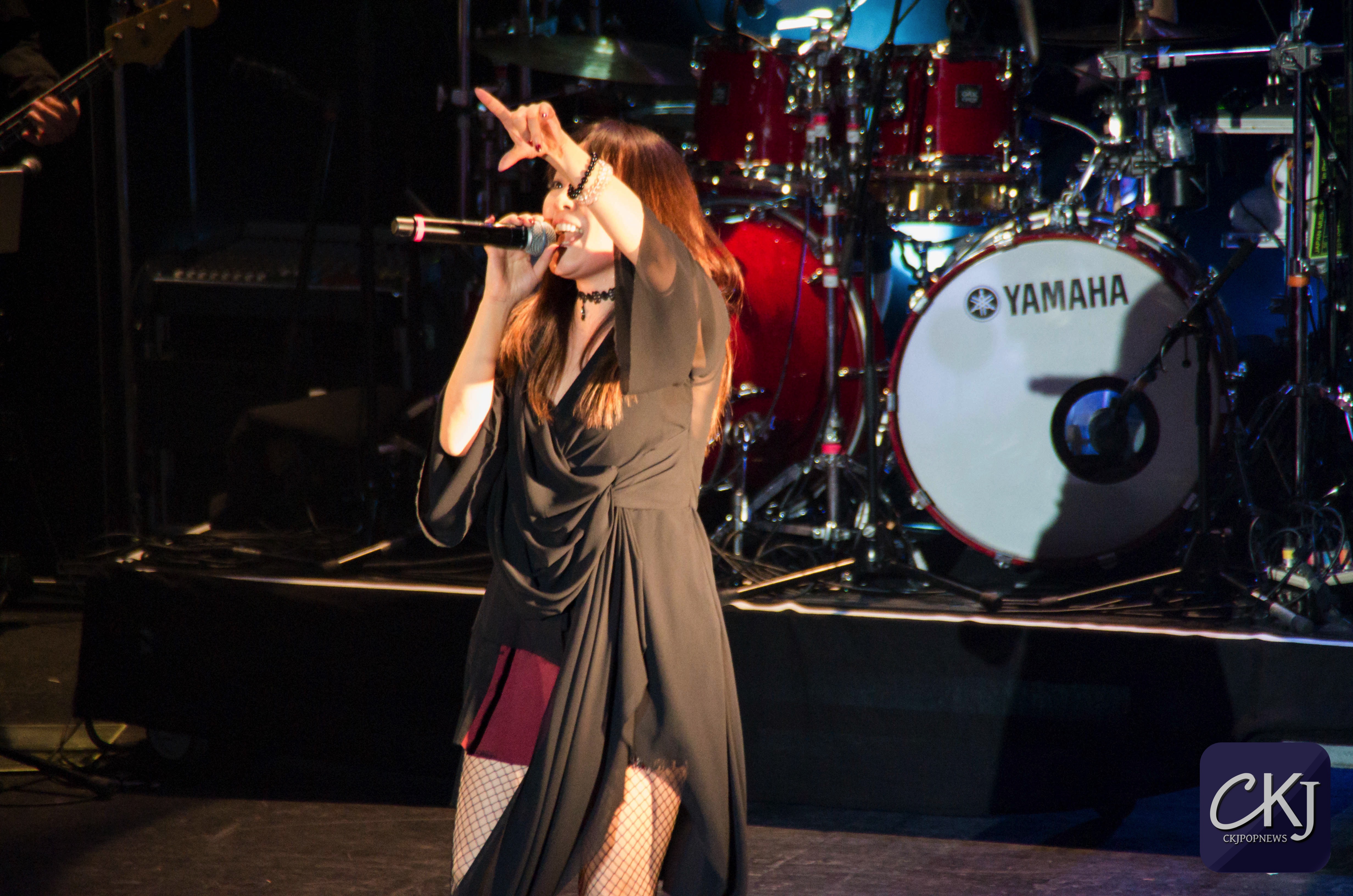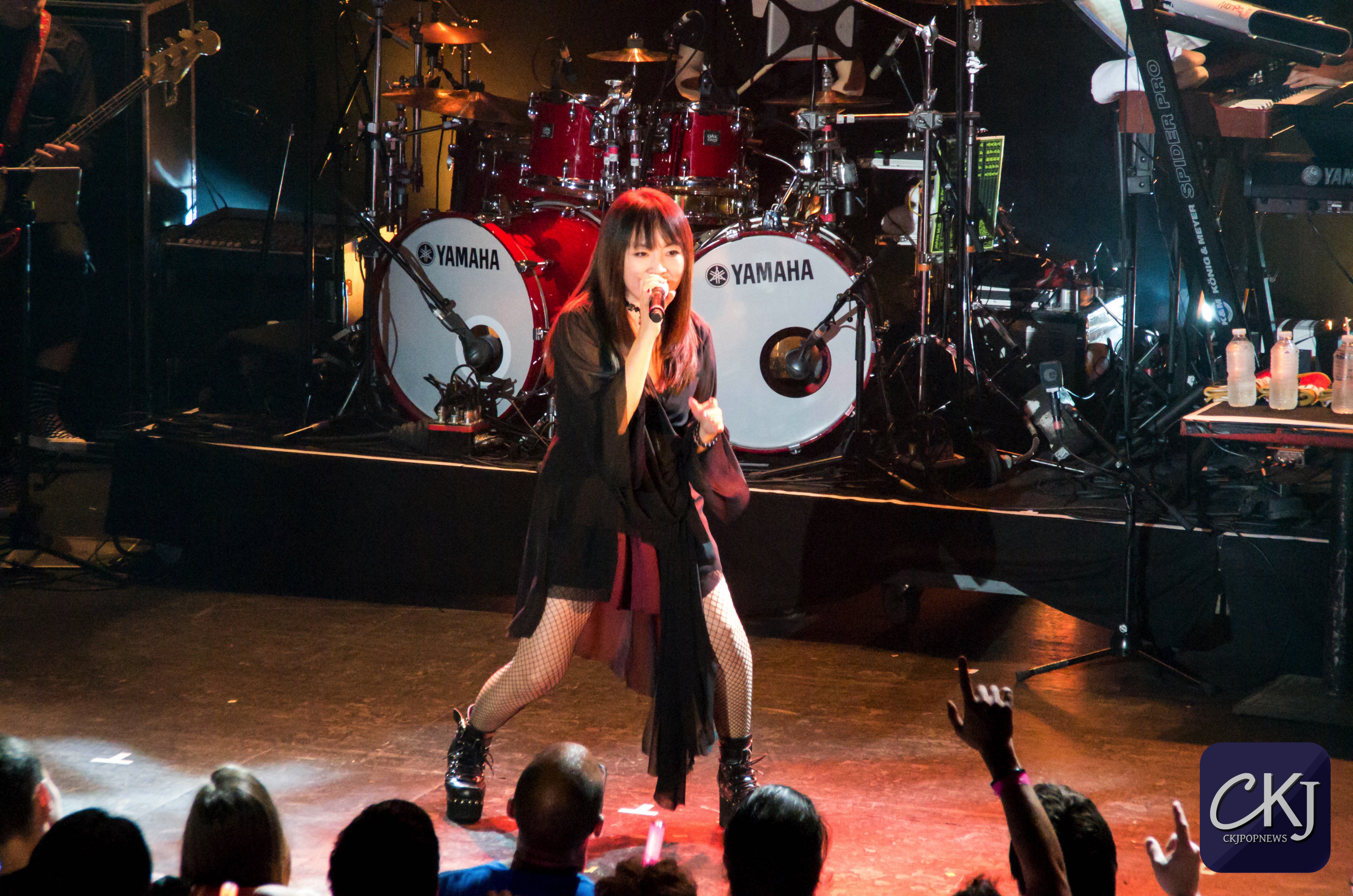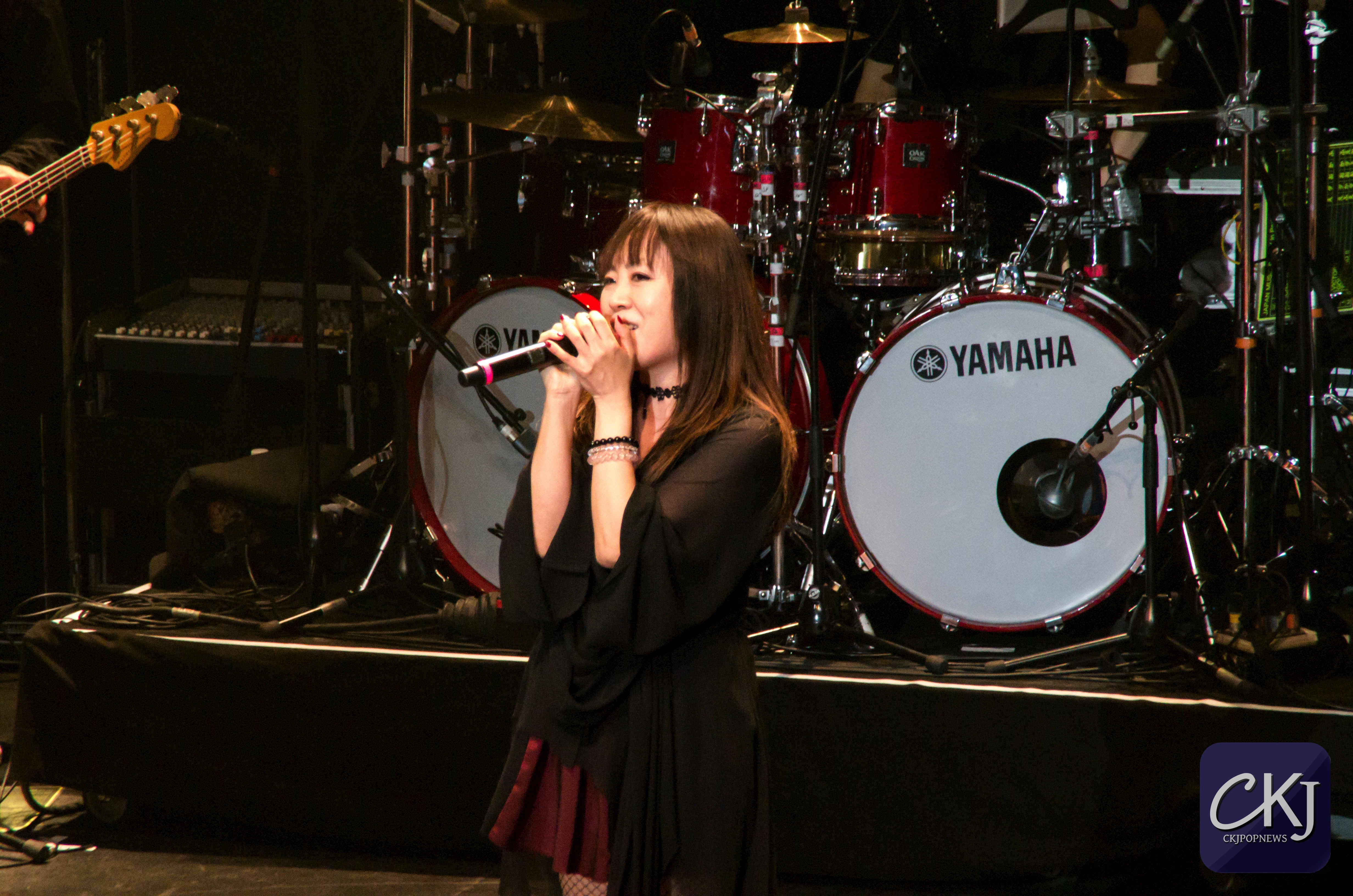 À peine arrivée au centre de la scène, Masami Okui entame son set sans aucune hésitation. Elle représente véritablement le côté envoutant du groupe, à la fois avec sa voix qui se distingue radicalement des autres membres du groupe (pour des raisons plutôt évidentes), mais aussi pour sa gestuelle si particulière.