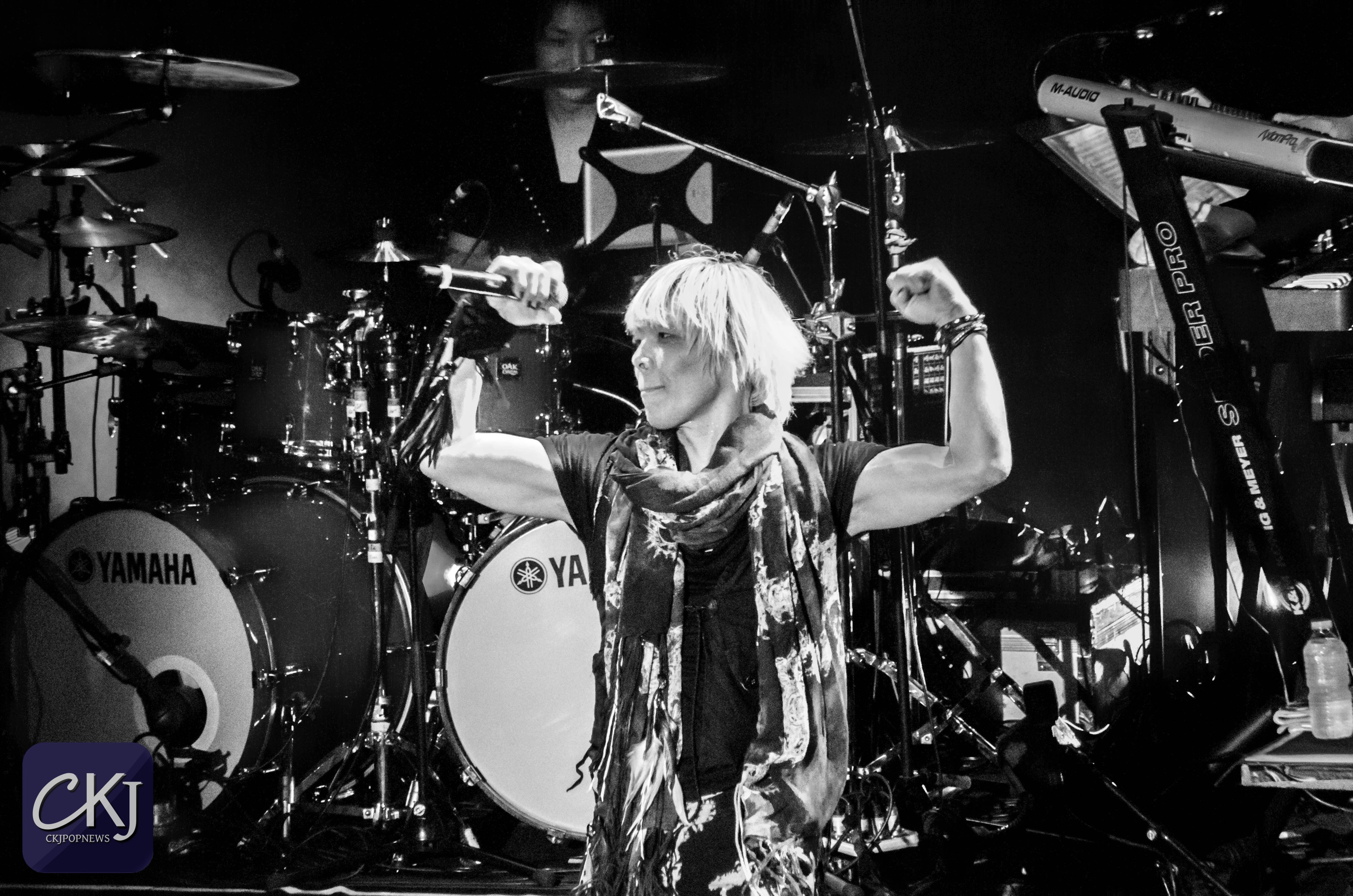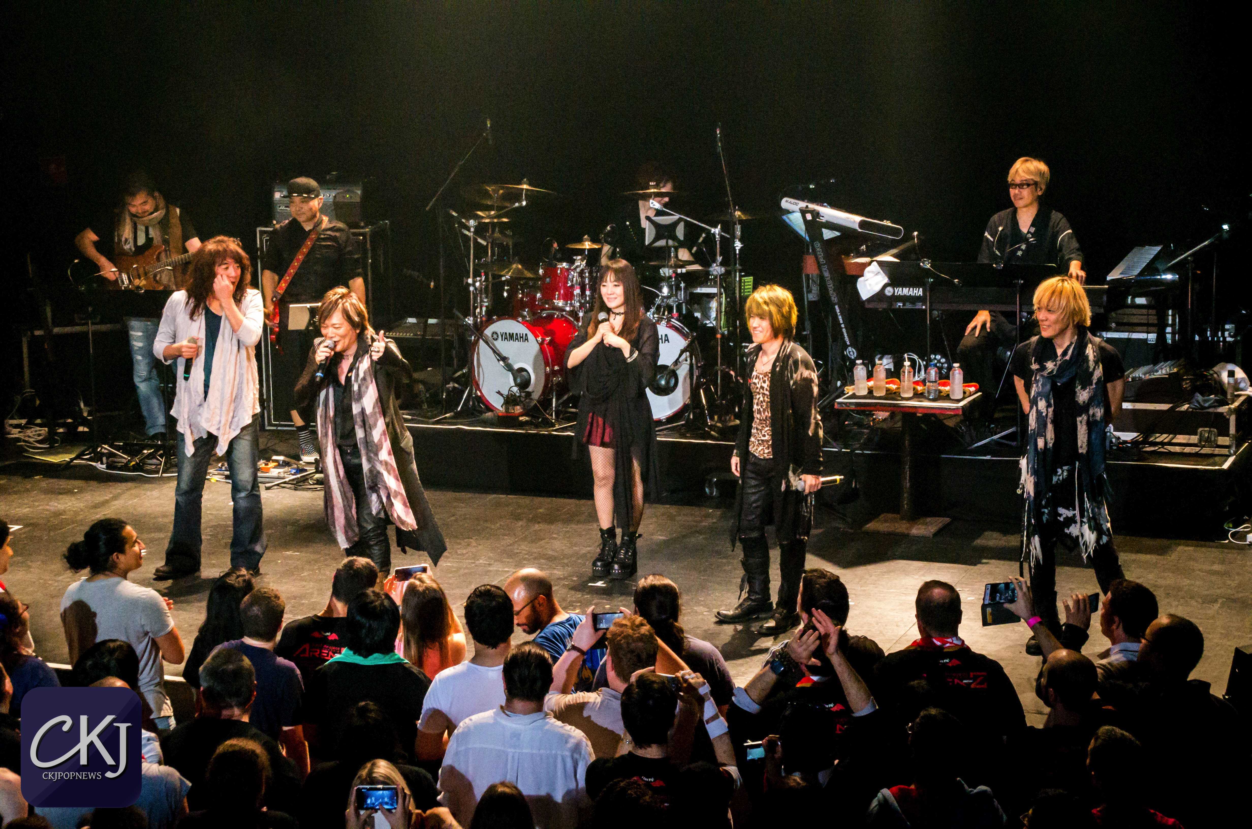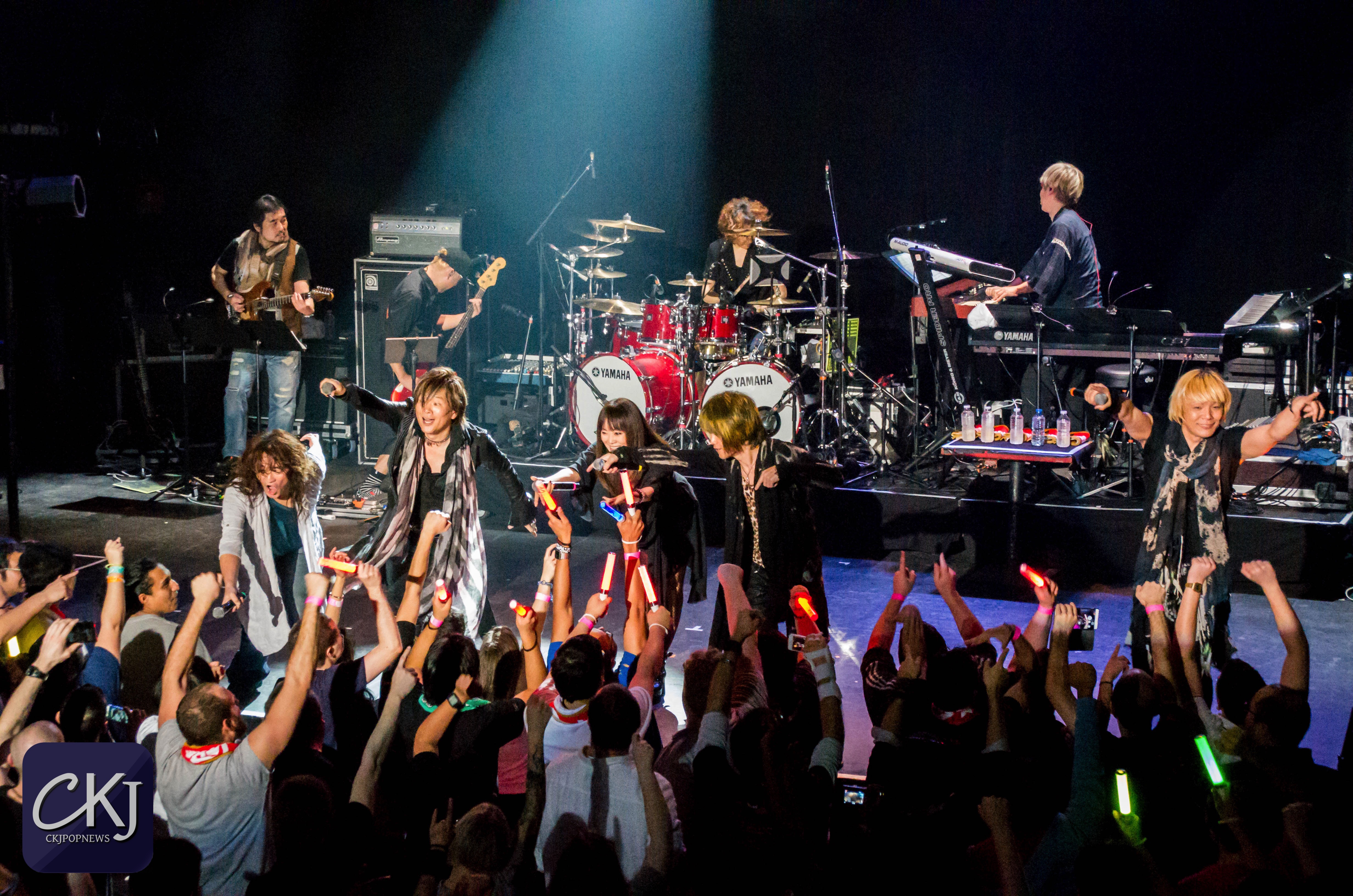 « Ça fait 8 ans que nous ne sommes pas venus en France. La dernière fois c’était en 2008 à Japan Expo. Nous sommes heureux de vous revoir, merci ! Éclatez-vous pendant notre concert d’anison ! [ndlr : le terme ‘anison’ est une contraction de ‘anime’ et ‘song’ et désigne donc les chansons qui forment les bandes originales des anime]. Vous devez connaitre une bonne partie de nos chansons, alors chantez en choeur avec nous si vous les connaissez ! »