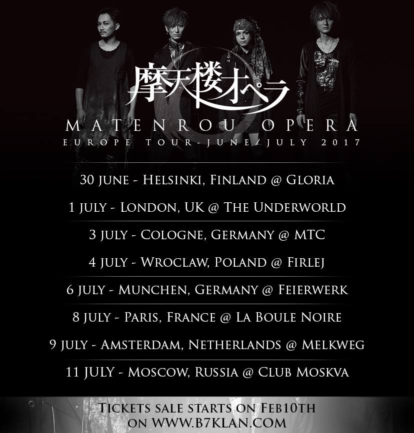 B7KLAN vient d’annoncer le prochain groupe japonais à venir en France : il s’agit cette fois-ci de Matenrou Opera. À l’occasion de leur tournée européenne qui se déroulera en juin et en juillet, le groupe fera escale à Paris le samedi 8 juillet, dans la salle de la Boule Noire.