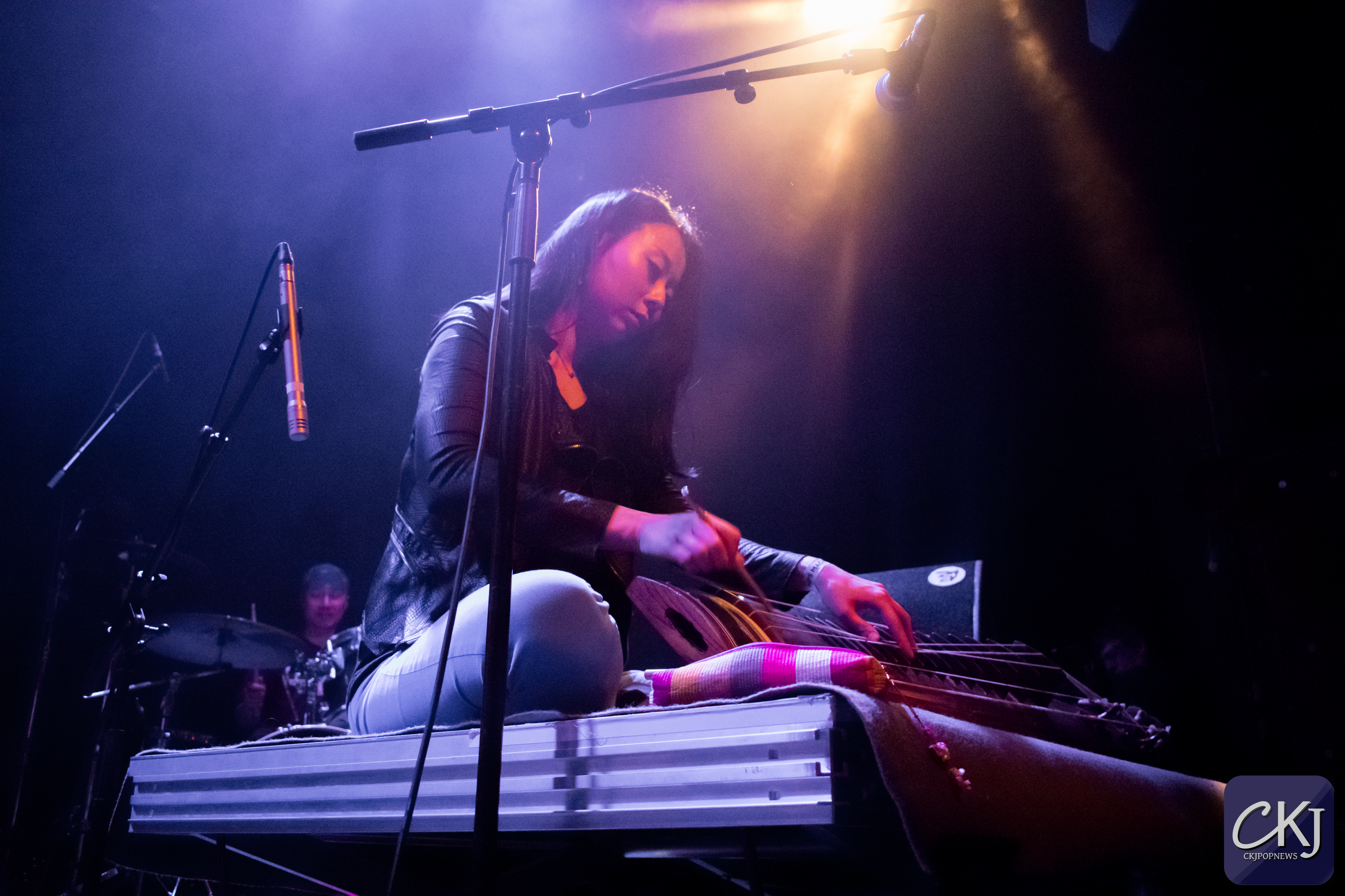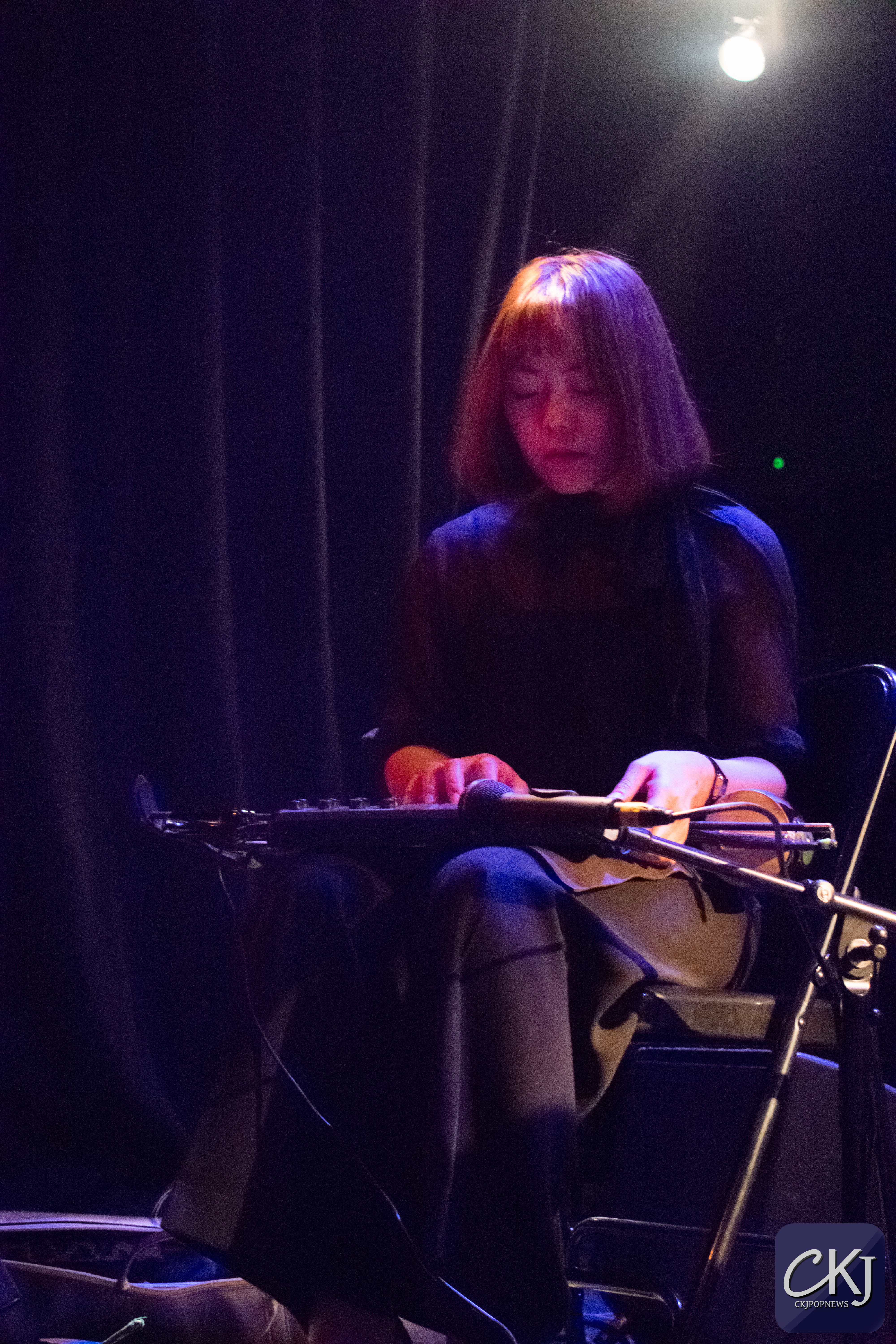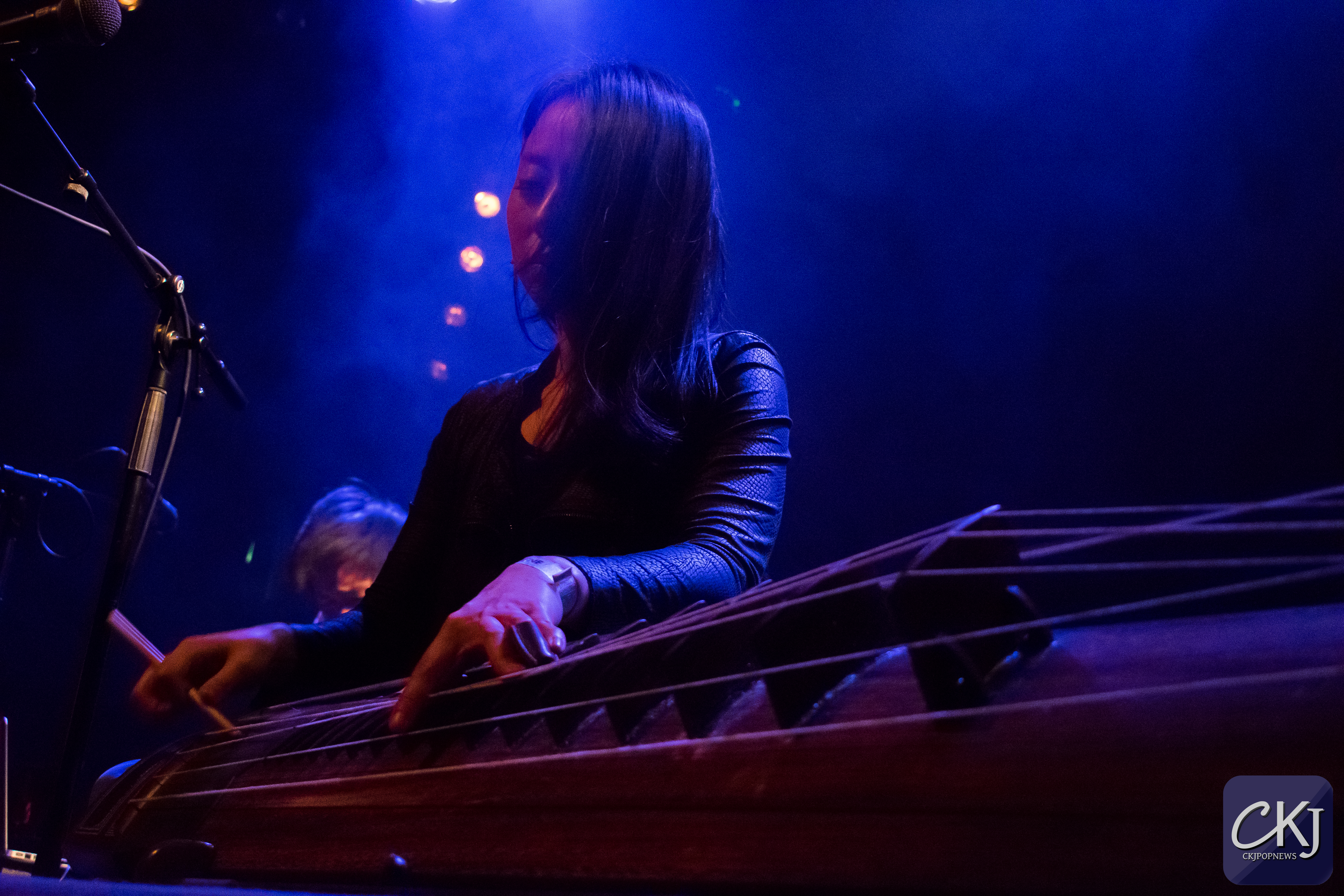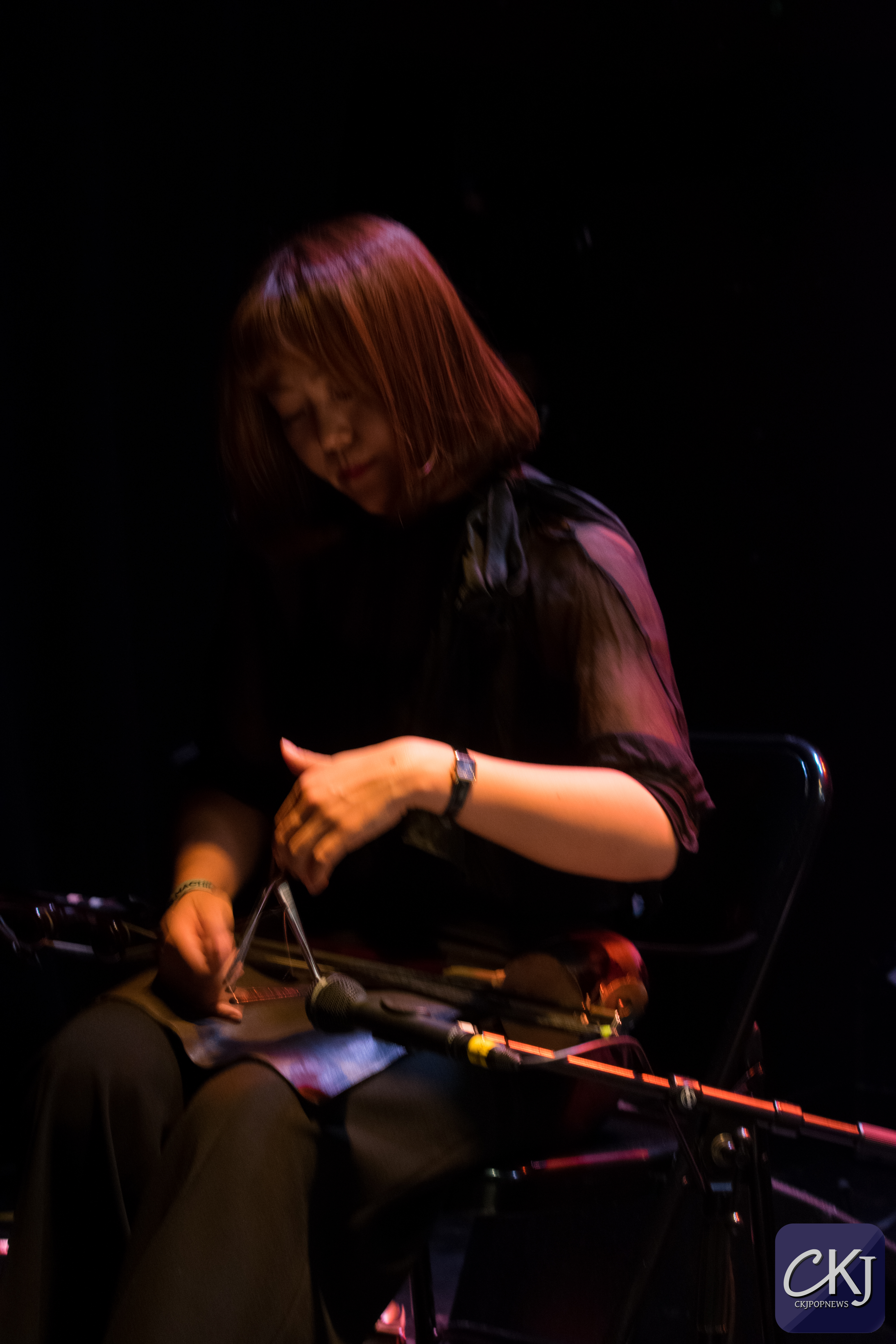 A sa gauche se trouvait EunYong Sim accompagnée de son geomungo : c’est un instrument à cordes de la famille des cithares. Il se joue assis sur le sol en frottant les cordes avec un petit bâton en bambou appelé suldae qui se tient entre l’index et le majeur de la main droite pendant que la main gauche appuie sur les cordes pour produire différents sons, différentes notes.