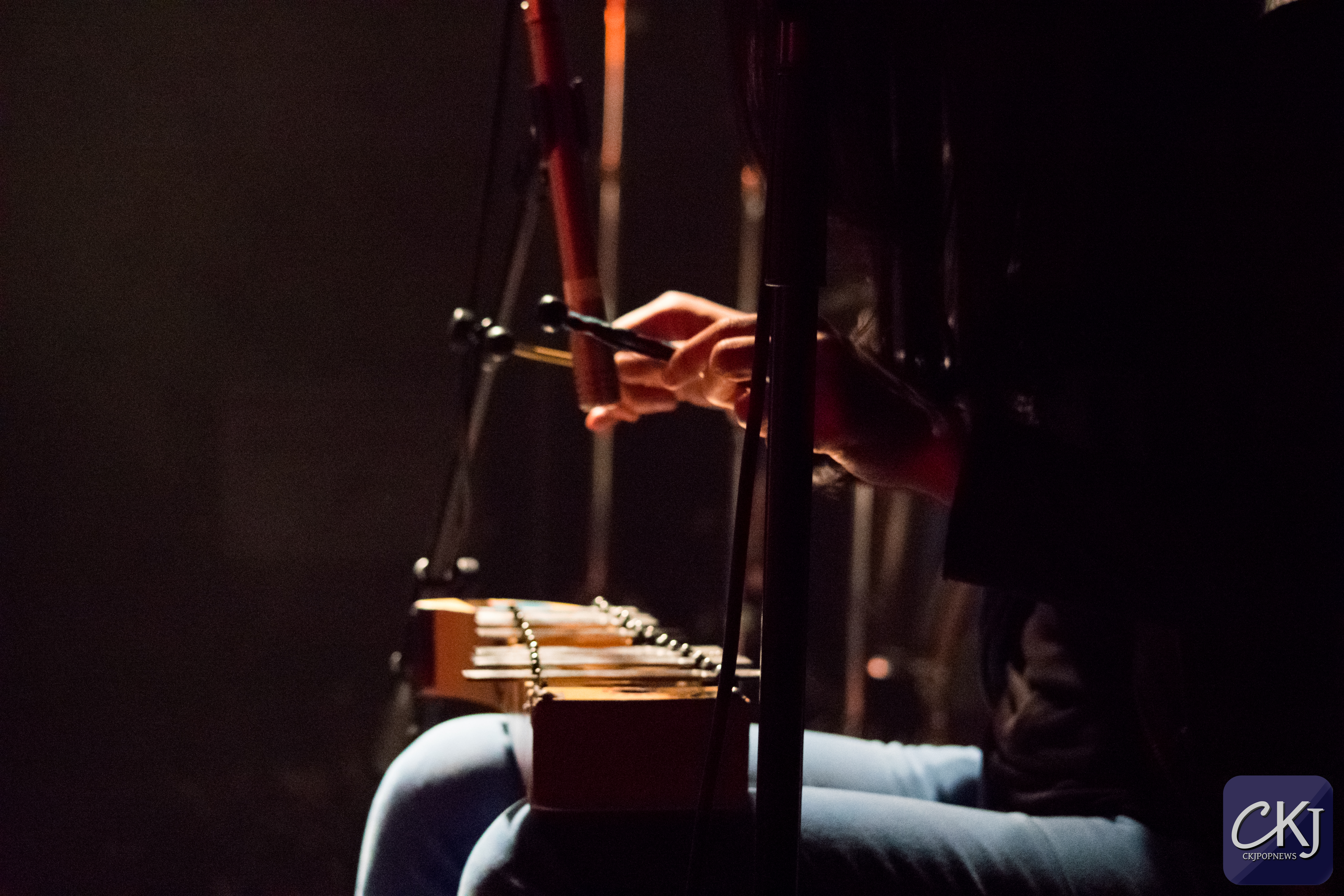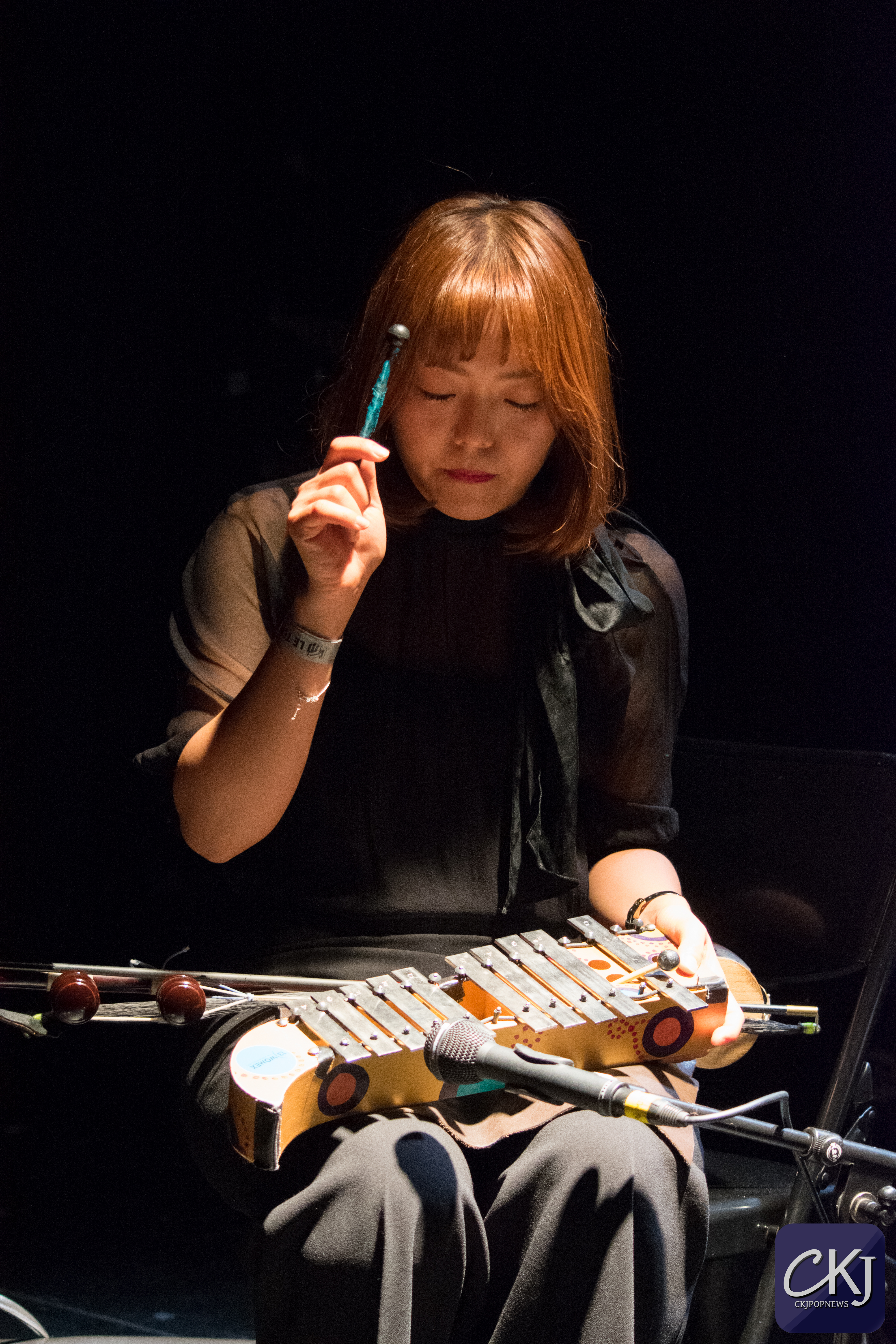 A sa droite se trouvait Bomi Kim, alternant entre un petit glockenspiel en bois et un haegum. Le glockenspiel est un instrument de musique à percussion rappelant un peu le son d’un carillon. Quant au haegum, c’est un instrument encore moins commun à nos yeux, bien que très utilisé en Corée, mais au son impressionnant et hypnotisant ! Je pourrais l’écouter pendant des heures tellement le son qui en émane est sublime. Il s’agit en fait d’un instrument à cordes qui pourrait faire penser à un violon bien que la forme soit différente. Il est fait d’une tige en bois sous laquelle se trouve une boîte sonore creuse elle aussi en bois et de deux cordes en soie tendues. Il se tient verticalement et est posé sur les genoux et joué avec un arc.