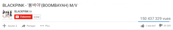 Ainsi, le MV “BOOMBAYAH” a dépassé le record de “Playing with fire” qui avait fait 100 millions de vues et se classe donc premier parmi les autres MV des filles suivit de “Playing with fire” qui est à plus de 111 millions de vues et de “Whistle” à plus de 107 millions de vues.