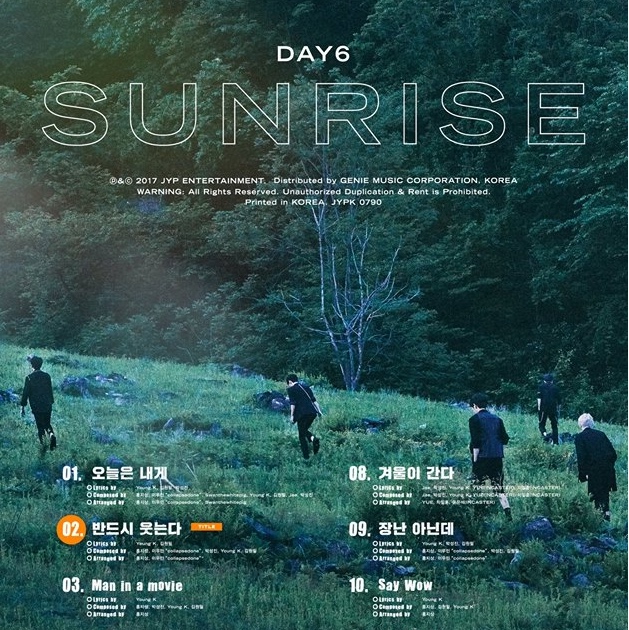 Le premier album des DAY6 s’intitule “Sunrise” et sortira le 7 juin prochain. Rappelons que cette année, la JYP a décidé de laisser sa chance aux membres de DAY6 leur chance, et les garçons dévoilent donc chaque mois un single composé de deux chansons, ainsi qu’un clip. Avec la deuxième partie des teasers, la tracklist complète de “Sunrise” a aussi été diffusée sur les réseaux sociaux :