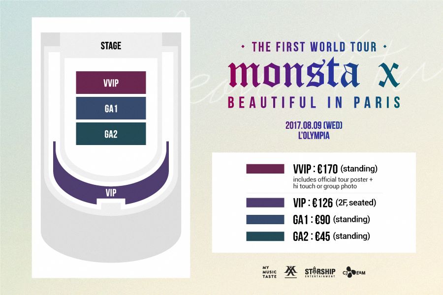 • VVIP : 170€ la place, placement debout + poster officiel de la tournée + hi touch OU photo de groupe avec les MONSTA X + un ticket pour gagner un poster dédicacé par le groupe (seulement 20 gagnants)