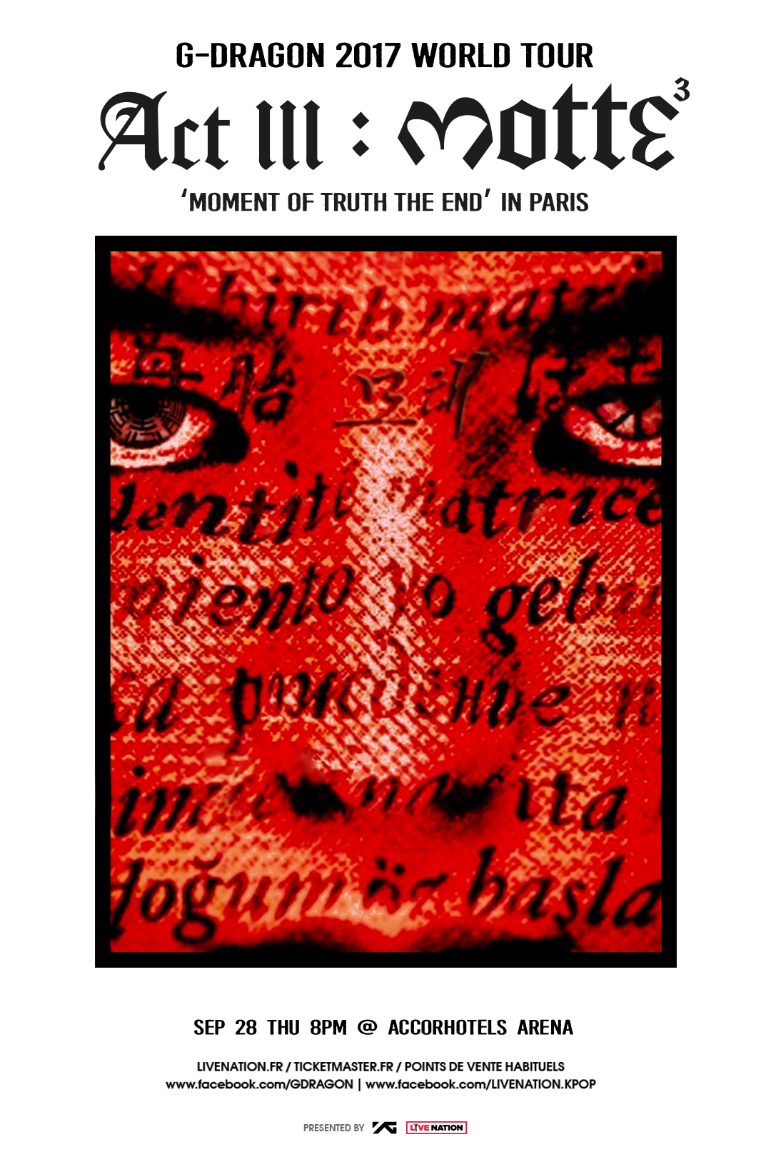Grande nouvelle aujourd’hui, que beaucoup n’attendaient plus : G-Dragon, leader du célèbre groupe de K-Pop BIGBANG, sera en concert exceptionnel à Paris, le 28 septembre prochain dans la salle de l’AccorHotels Arena (ex-Bercy), pour une date unique en France, ) l’occasion de sa tournée mondiale solo <ACT III, M.O.T.T.E>. Poster promotionnel de la tournée européenne et poster de la date française :