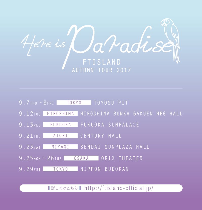 Le groupe coréen FTISLAND a annoncé il y a quelques semaines la sortie de son nouveau single japonais. Celui-ci s’intitulera “Paradise” et sortira le 23 août. Comme pour chaque sortie japonaise, une tournée débutera pour faire la promotion du single et parcourra plusieurs villes japonaises dans les semaines suivantes.