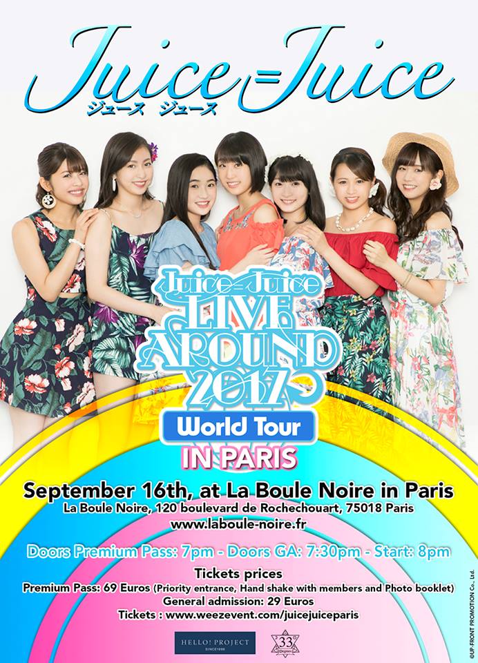 Samedi 16 septembre, un groupe d’idols est venu arpenter la scène parisienne pour la première fois, et l’équipe de CKJ a repondu présent à l’appel ! Dans le cadre de la tournée mondiale “Juice=Juice LIVE AROUND 2017 -World Tour-“, les Juice=Juice, désormais composées de 7 membres, sont venues se produire devant le public francais, sur la scène de La Boule Noire de Paris. C’est le deuxième groupe du Hello!Project à faire honneur à la France cette année, et les fans ont été nombreux au rendez-vous, pour une date qui au final a très vite affiché complet.