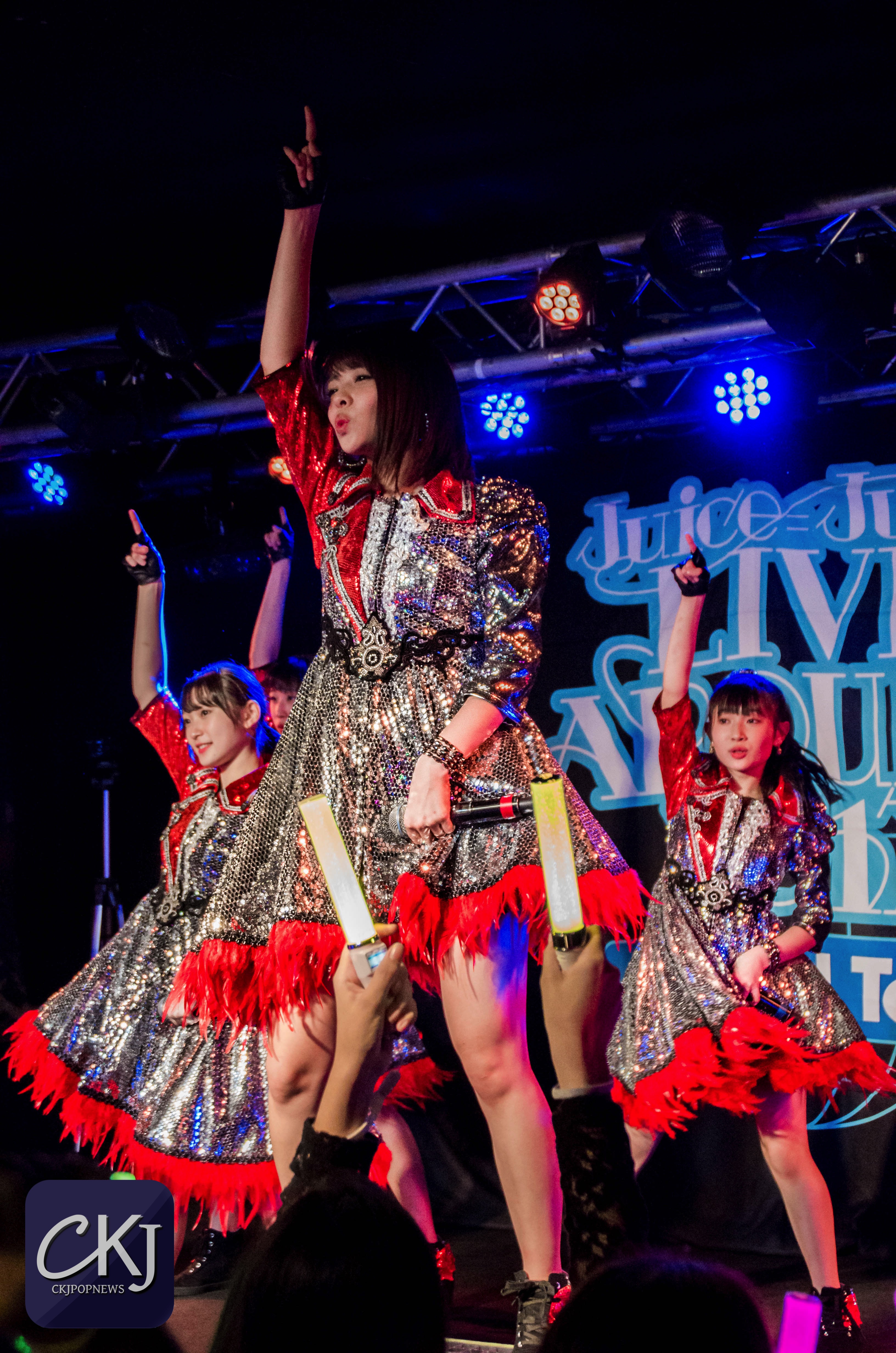 Le public et les filles ont continué de se lâcher et c’est finalement quelques minutes à peine plus tard que les stars du jour ont enfilé par-dessus leurs nouvelles tenues des vestes colorées en direct sur la scène, une fois de plus. Avec un public synchronisé avec la chorégraphie déjantée de la chanson “Jidanda Dance” (“地団駄ダンス”), les filles ont montré un réel plaisir à se produire devant les fans français qui ont, une fois de plus, fait honneur à leur réputation. À la fin de cette chanson au rythme effréné, les Juice=Juice ont fait une seconde pause pour s’adresser au public, et pendant laquelle elles ont notamment parlé de leur séjour à Paris.