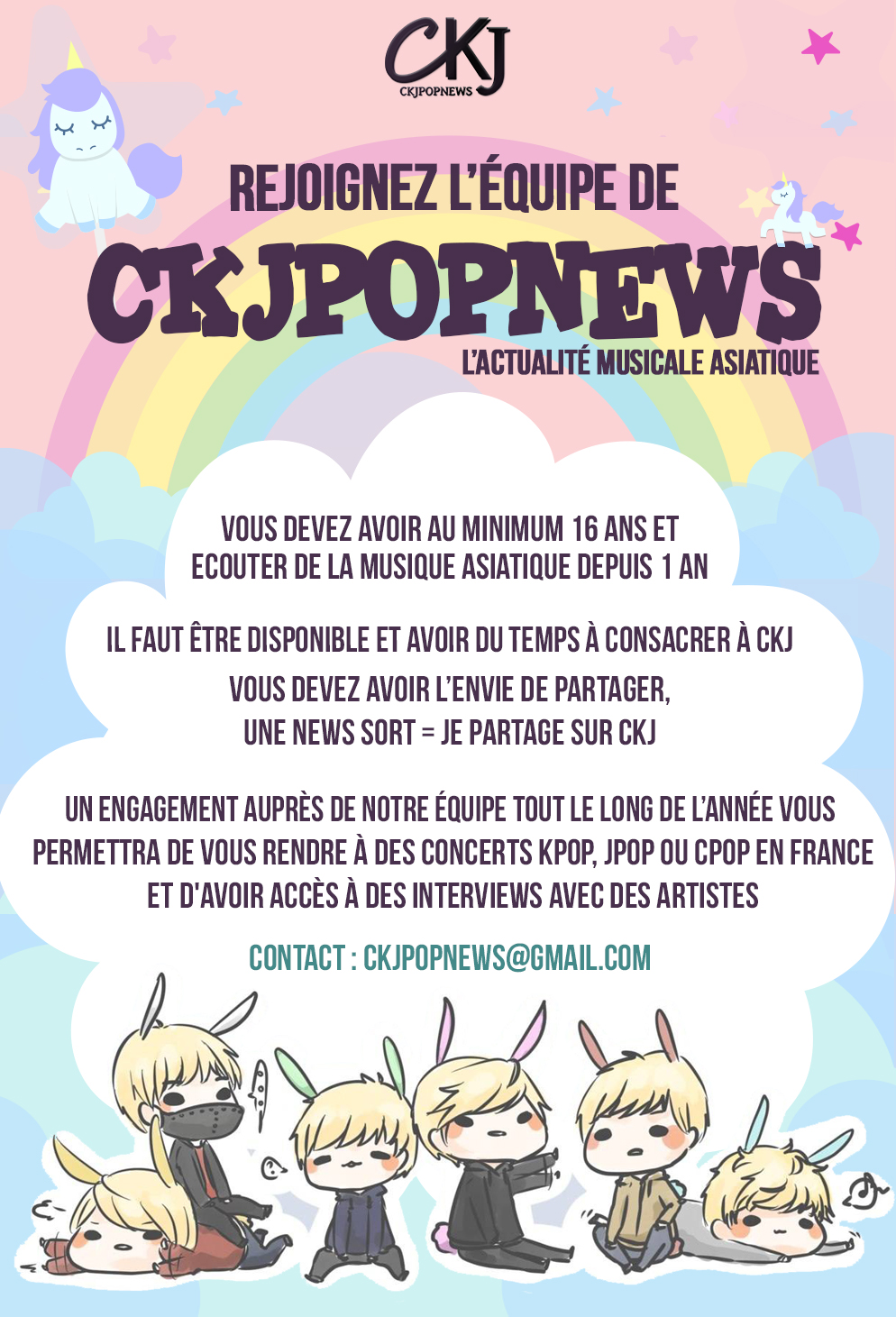 Vous êtes passionné de musique asiatique ? Vous avez du temps et souhaitez partager votre passion ? Ckjpopnews a besoin de vous ! Nous recherchons pour une LONGUE durée des nouveaux auteurs TRES MOTIVES afin de nous aider au quotidien !
