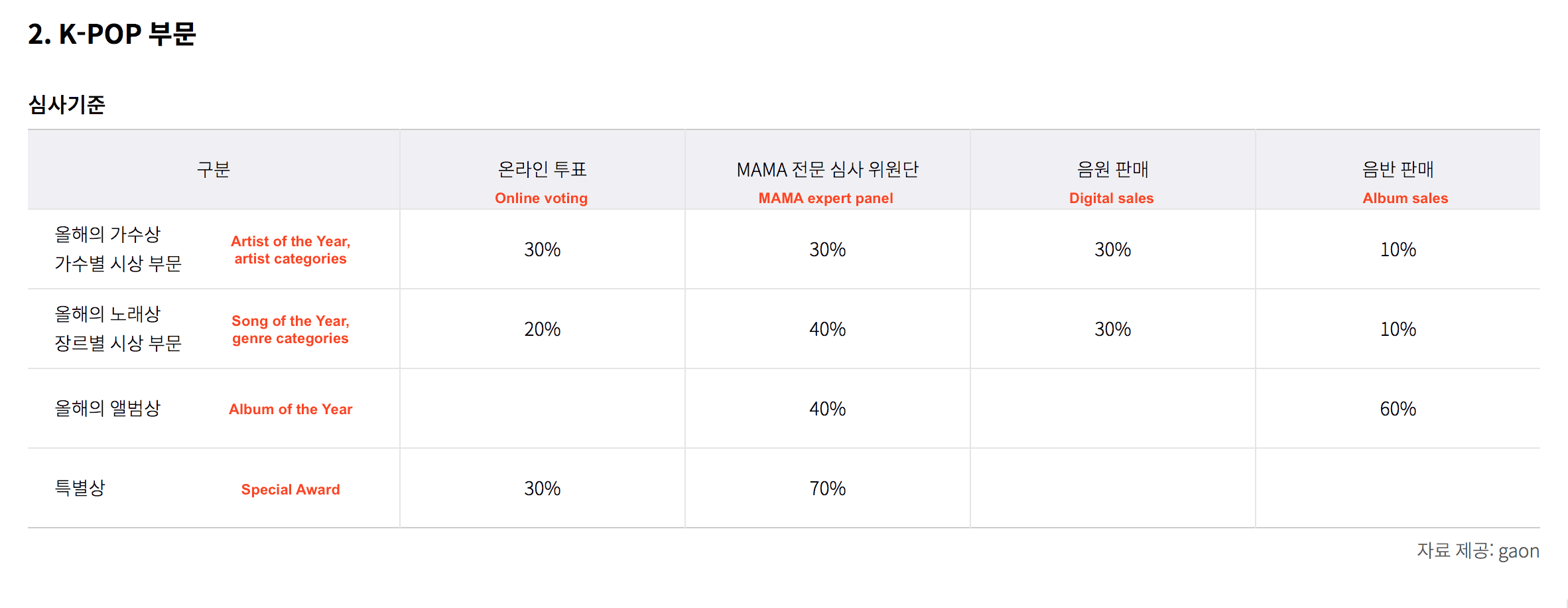 Du 19 octobre au 28 novembre, les MAMA ont organisé en ligne un vote pour 19 catégories de cette cérémonie de récompenses. Les fans ont donc pu voter pour les nominés, une fois par jour et par personne. Les votes compteront de 20% à 30% du score final, selon les critères déterminés par les MAMA, qui sont les suivants :