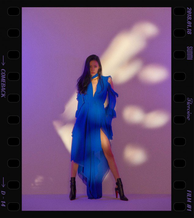 La chanteuse Sunmi a dévoilé des teasers pour son prochain comeback, qui s’intitule “Heroine“. Tout d’abord, ce sont d’abord deux photos teaser que Sunmi a dévoilé sur ses réseaux officiels. Habillée d’une robe bleue, la chanteuse expose le code couleur de son retour, le violet, via l’addition d’un coeur bleu et d’un coeur rouge. Voici les clichés pour “Heroine” :