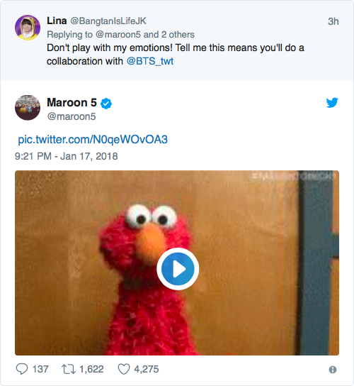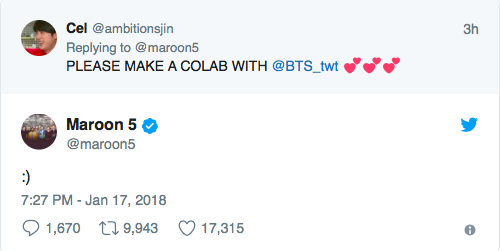 Le 18 janvier, une fan a répondu à un tweet des Maroon 5, en leur demandent une collaboration avec les BTS. Contre toute attente, le groupe a répondu à l’aide d’un smiley :
