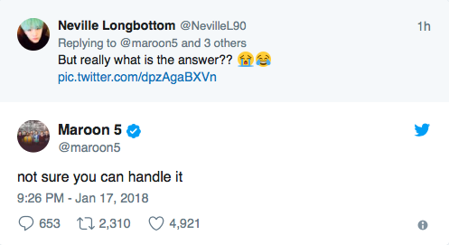 Après ce tweet, Maroon 5 ont répondu une seconde fois, cette fois-ci avec un gif, sur lequel on peut voir le personnage Elmo hausser les épaules.