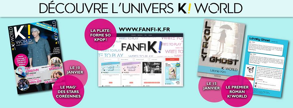 K!world est un nouveau magazine 100% Kpop et K-Dramas qui sort partout en France une fois tous les deux mois avec des exclues venues directement de Corée grâce à des reporters sur place ! On y trouve des interviews d’Idols, des dossiers spécial Dramas, une rubrique K-Beauty, des recettes coréennes, des articles mode, des jeux, du FanArt. L’objectif est aussi de faire le pont entre les deux cultures grâce à des petits articles sur les traditions sud-coréennes ou encore une page dédiée à la langue coréenne (qui va sûrement se développer prochainement).