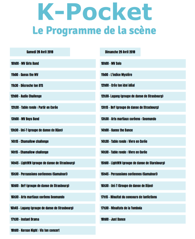 Pour ces deux jours consacrés à la passion de la culture coréenne, et grâce à l’engouement toujours grandissant pour la K-Pop en France, l’association Kakemono vous proposera plein de surprise sur cette première édition de K-Pocket, à savoir des spécialités coréennes, des cosmétiques, de la calligraphie, des arts martiaux, des percussions traditionnelles, des infos sur les voyages en Corée du Sud, des goodies, des groupes de dance cover sur scène, des jeux et bien d’autres surprises qui vous seront dévoilées plus tard.