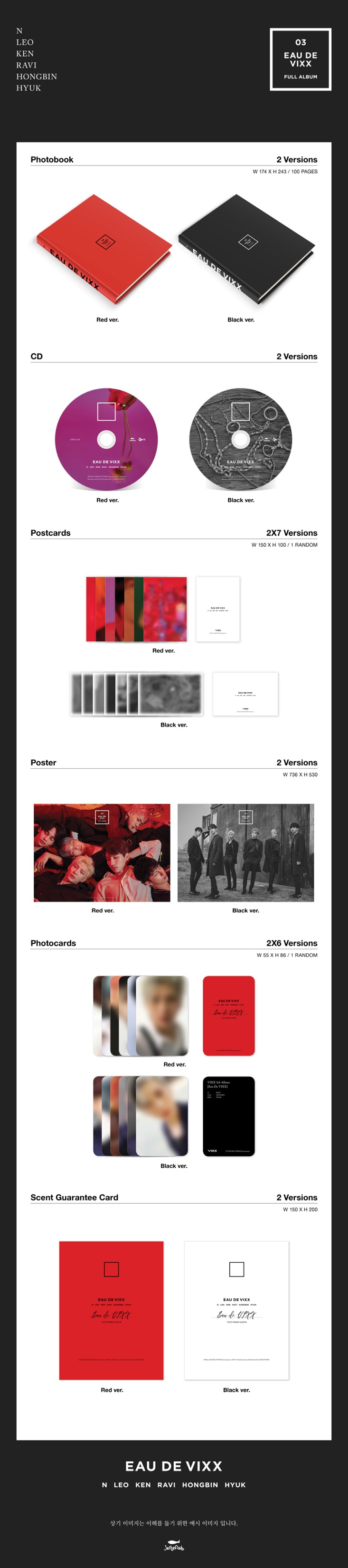 Nous connaissons également les détails de ce full album qui sera disponible en deux versions : une “Red” et une “Black“. Elles contiendront toutes les deux : 1 carte postale au hasard sur 7 possible, 1 photocarte sur 6 possible, 1 photobook de 100 pages  1 scent guarentee card, 1cd et 1 poster différent selon la version.