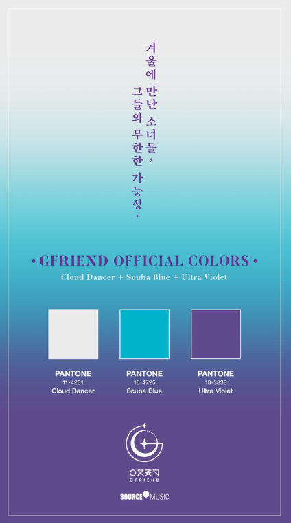 Sept mois après leur dernier comeback coréen avec le repackage album “Rainbow” et la chanson “Summer Rain” en septembre 2017, GFRIEND sera de retour en Corée du Sud le 30 avril à 18h (heure coréenne) avec un sixième mini album “Time for the moon night“. En prévision de ce prochain retour, les six jeunes femmes ont déjà sorti plusieurs photos et vidéos cependant au cours de cette révélation de teasers, GFRIEND a annoncé ses couleurs officielles par le biais d’une image postée sur le compte twitter officiel du groupe. Celles-ci sont donc le “Cloud Dancer“, le “Scuba Blue” et l'”Ultra Violet” :