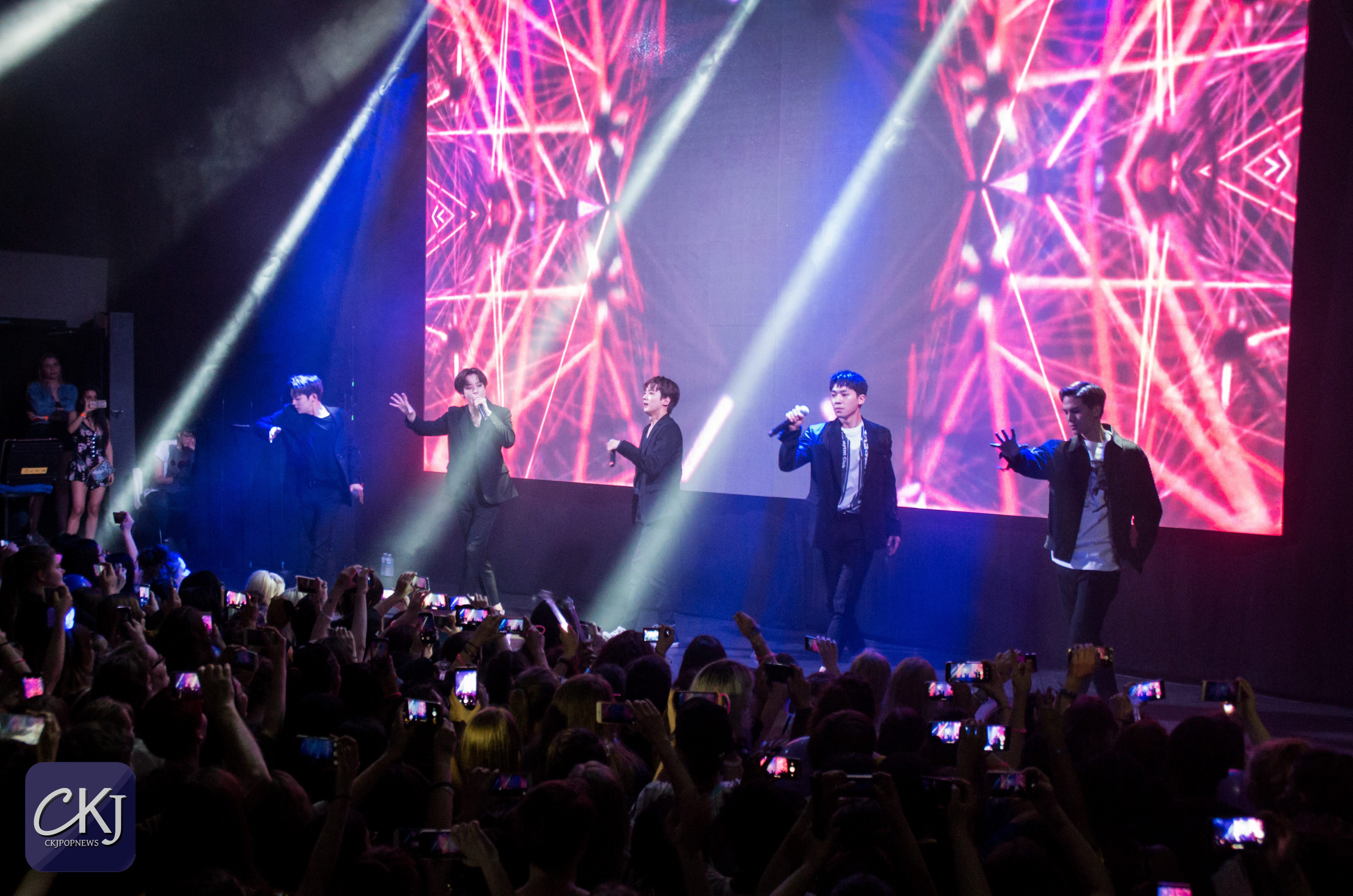 Dans une ambiance un peu plus night club, donnée par le côté très pop de la musique et les éclairages colorés et vifs, les Teen Top ont interprété “Hot Like Fire” ainsi que la chanson titre de leur prochain opus “SEOUL NIGHT“, en exclusivité sur la scène française. Pour ce titre, les cinq garçons ont dansé à nouveau derrière leurs micros, de quoi nous offrir un aperçu de ce que donnera ce prochain comeback, au bout de 7 ans de carrière.
