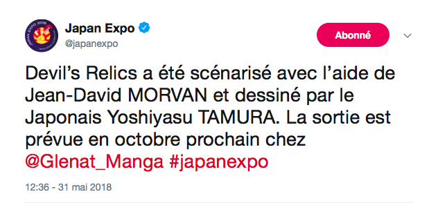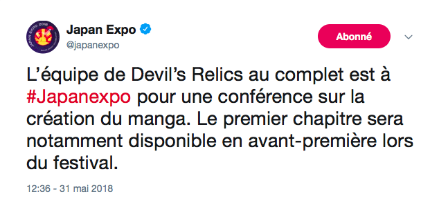 Comme vous pouvez le voir, le premier tome du manga ne sera disponible qu’au mois d’octobre chez Glénat, mais toute l’équipe du manga, dont Maître Gims et son frère, seront de la partie pour une conférence qui présentera la création de Devil’s Relics. Le tout premier chapitre sera également à retrouver en avant-première sur Japan Expo !