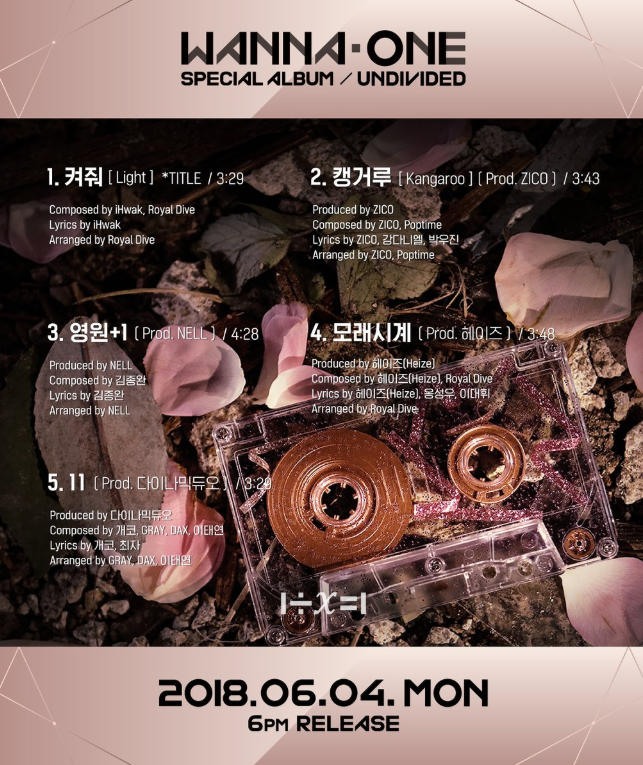 Le comeback du groupe Wanna One avec l’album spécial “1÷χ=1 (UNDIVIDED)” se fera le 4 juin prochain à 18h (heure coréenne). Comme nous l’avons appris, auparavant cet album contiendra les quatre chansons des quatre premières sous-unités inédites du groupe, c’est ainsi que grâce à la tracklist nous connaissons désormais les titres de ces chansons.