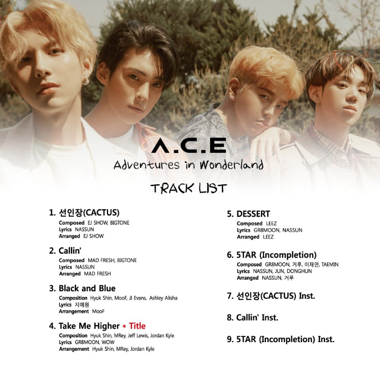 Le groupe A.C.E composé seulement de quatre membres Jun, Byeongkwan, Donghun et Wow, Chan étant actuellement occupé avec les promotions de UNB, s’apprête à faire son comeback le 7 juin prochain avec l’album “Adventures in Wonderland”. A l’approche de ce retour, ils nous ont déjà révélé deux séries de photos teasers “day” et “night” ainsi qu’un premier teaser du clip de leur prochaine chanson titre. Grâce à la révélation de la tracklist, nous savons que ce nouvel album contiendra neuf morceaux : “CACTUS”, “Callin'”, “5STAR” (Incompletion) qui sont des singles digitaux qu’ils ont déjà sorti auparavant et dont nous retrouverons en plus les version instrumentales et “Black and Blue”, “DESSERT” et leur nouvelle chanson titre “Take Me Higher”.