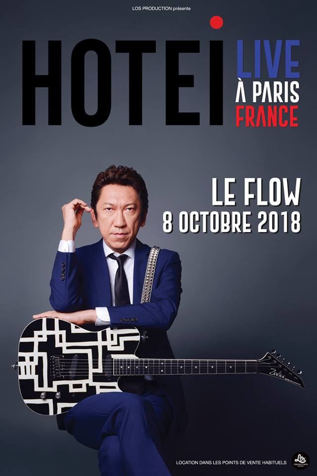 Après une tournée nippone de 17 dates, du 26 octobre au 22 décembre, pour défendre son tout dernier album “Paradox“, l’artiste HOTEI sera de retour sur les planches française pour une date unique en France, qui aura lieu à Paris le 8 octobre, dans la salle du Flow (7ème arrondissement). Voici le poster promotionnel :