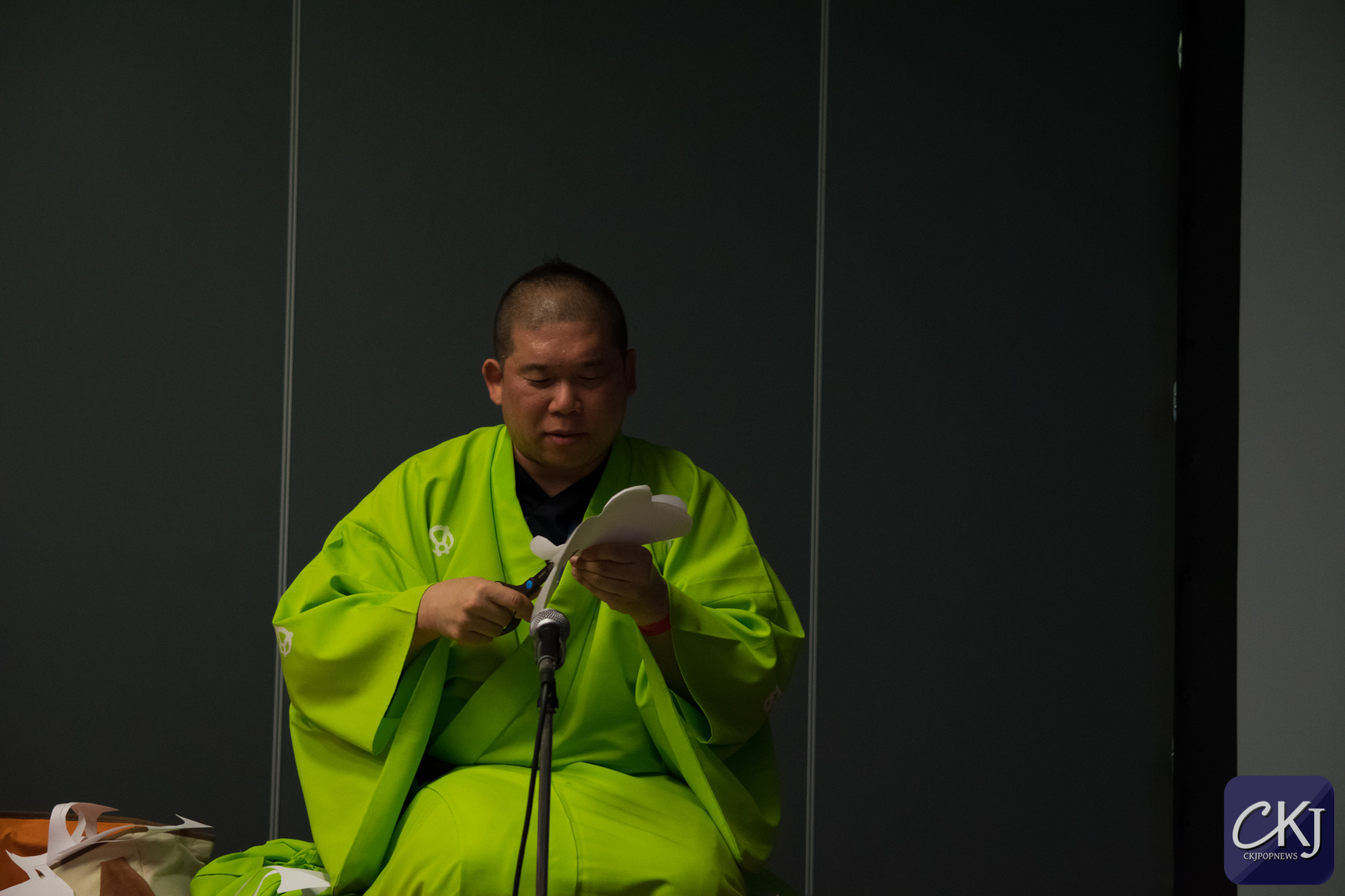 Cet artiste japonais ne s’arrête d’ailleurs pas au Kabuki ! Il joue aussi du Shamisen, instrument à cordes japonais et nous a d’ailleurs interprété le célèbre morceau “Sur le pont d’Avignon”. Il nous a ensuite fait une démonstration de kami-kiri, art qui consiste à découper du papier de façon à représenter quelque chose de précis. Il a alors commenté “Je tourne en même temps que je découpe sinon c’est soporifique”, soulevant de nombreux rires dans le public. Nous avons donc pu découvrir la tête de Mickey, un personnage de One Piece et finalement un chat !