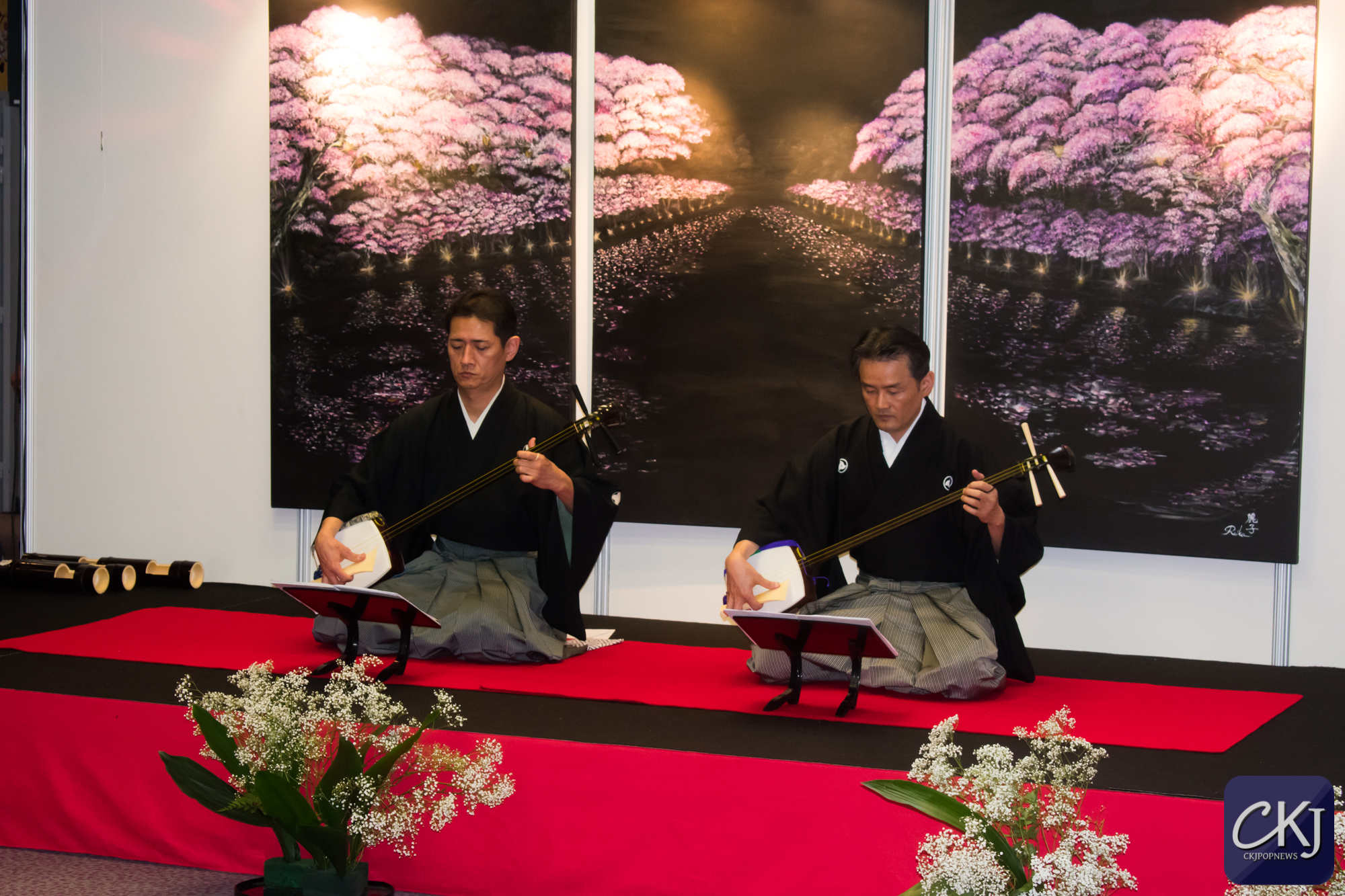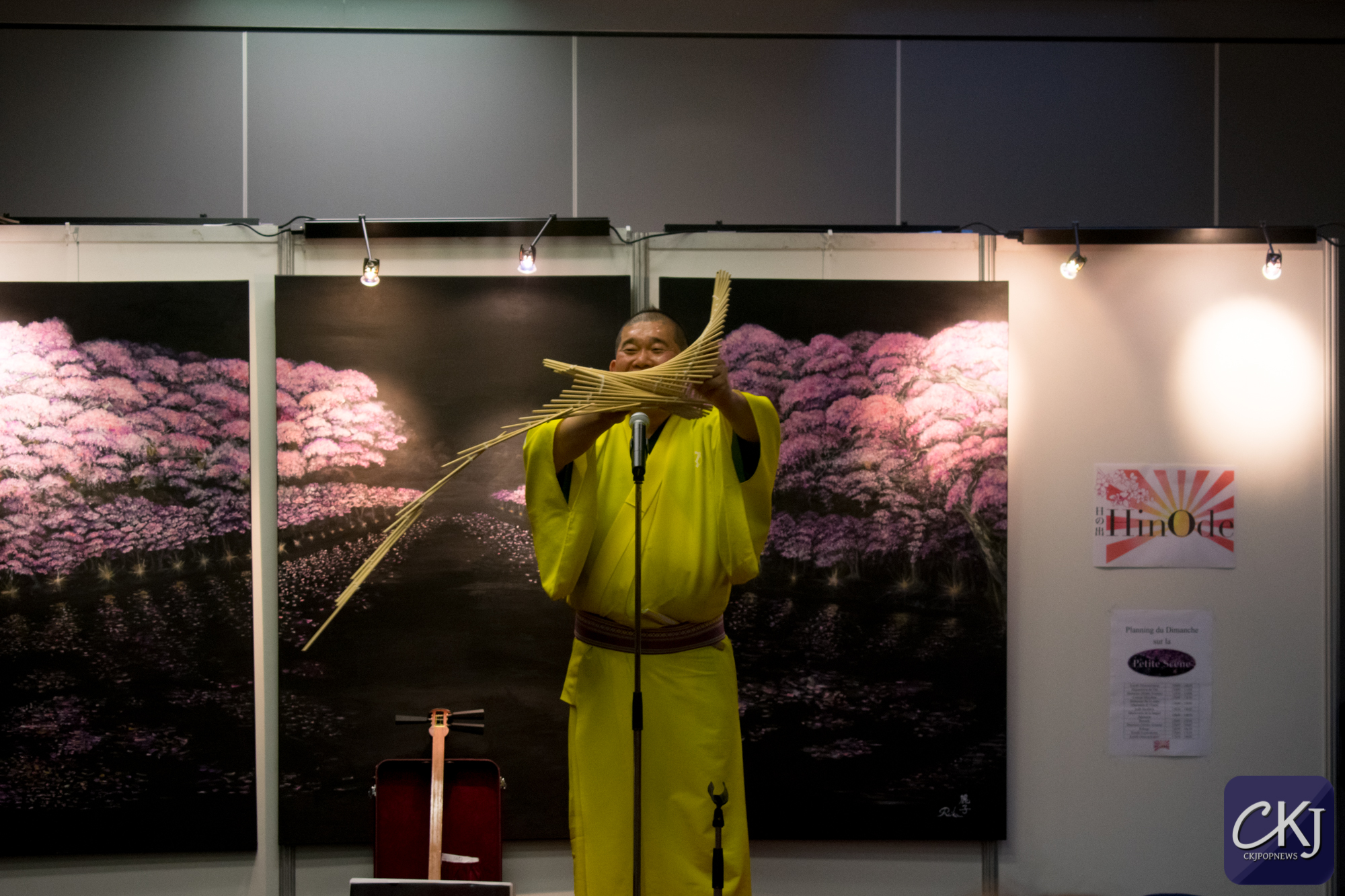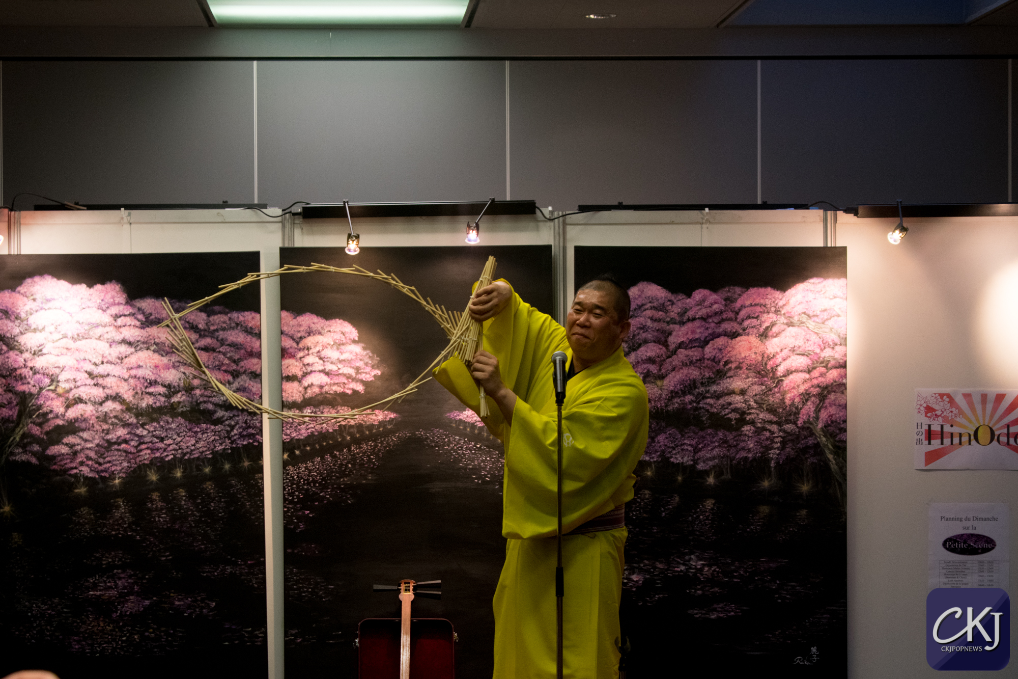 Il a terminé avec une démonstration d’un autre art qui a 400 ans et qui se pratique avec des tiges de bambous reliées les une aux autres, le Nankin tamasudare. Le public l’a accompagné en tapant dans les mains pour donner le rythme. Il nous a présenté le drapeau japonais puis le drapeau français, avec une bonne touche d’humour puisqu’il a seulement changé son “drapeau” de côté. Il a continué avec plusieurs tentatives pour représenter un gros poisson, faisant de nouveau monter les rires du public devant sa gestuelle si particulière.