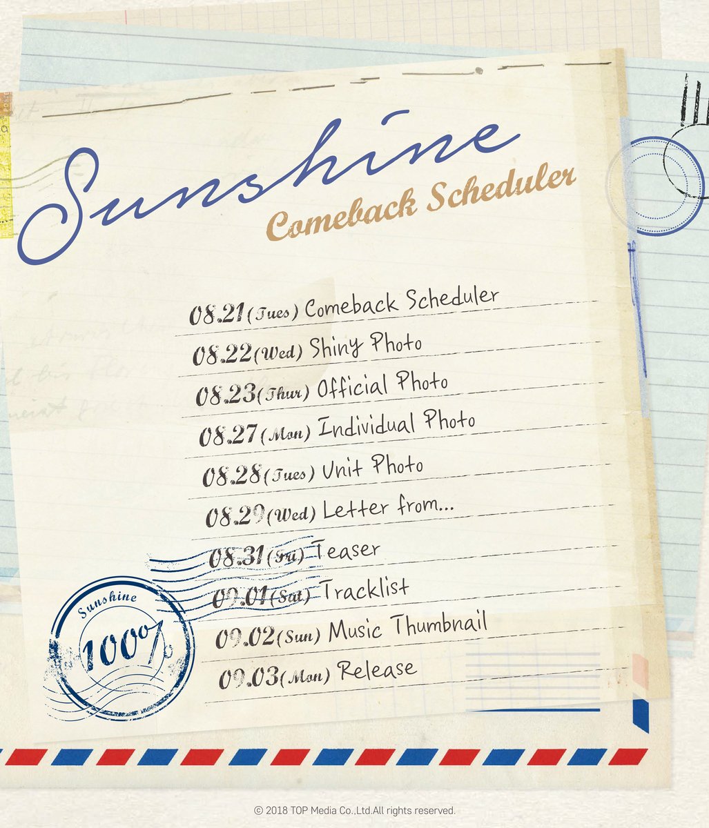 Le 21 août, les garçons ont annoncé la sortie de “Sunshine“, un opus qui sera dévoilé le 3 septembre. Un planning a été mis en ligne concernant les pré-promotions en ligne de cet opus. La première photo teaser sortira dans la journée, et le reste du teasing habituel se mettra en place dans les jours suivants. Voici le planning :