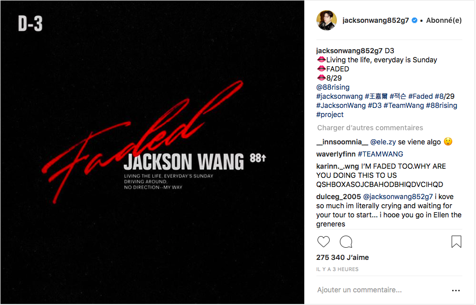 Le 26 août, Jackson Wang a surpris les fans avec un teaser complètement inattendu pour “Faded“, une collaboration à venir avec la plateforme médiatique américaine et label d’enregistrement 88Rising. À seulement trois jours de la sortie, qui aura lieu le 29 août, le teaser donne un indice sur les paroles en indiquant “Profitant de la vie, chaque dimanche / Faisant un tour en voiture / Pas de direction – mon chemin“. Voici le post en question :