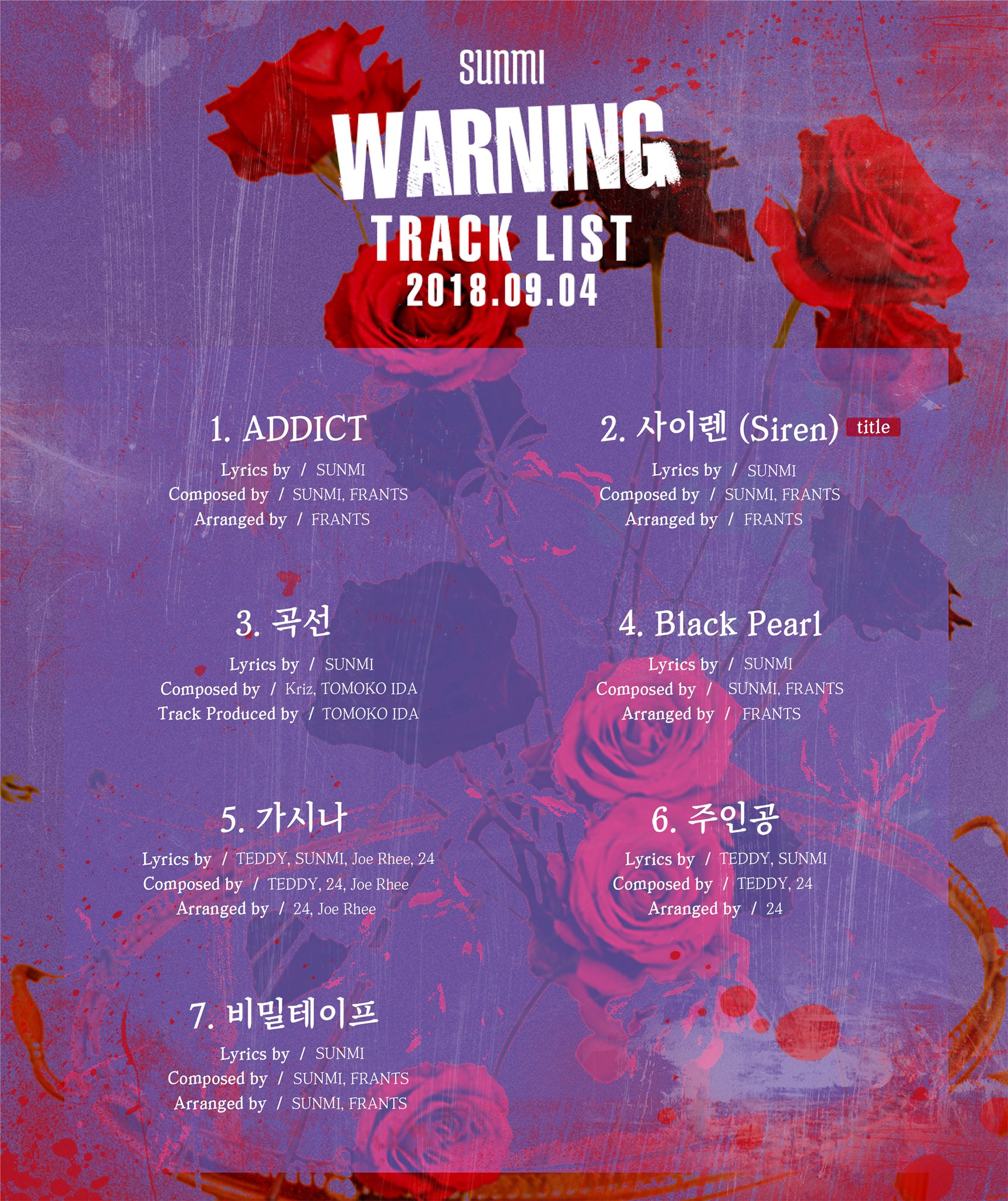 Après avoir partagé une série de teaser abstrait appelé ‘Object Teaser’ avec les différents noms des titres de l’album, la liste de chansons composant l’album “WARNING” a été révélé le 26 août. Il apparaît donc que l’album sera constitué de 6 chansons et le titre principale sera “SIREN“. Sunmi a participé à l’écriture des paroles de toutes les chansons de l’album mais aussi à la composition de 3 chansons, “ADDICT“, “SIREN” et “비밀테이프“.