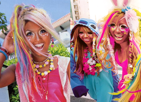 Le style Yamamba est donc né au tout début des années 2000. En plus du teint, limite noir pour certaines, leurs cheveux étaient blond platine ou dans des tons fluo comme le jaune, le bleu, le vert ou le rose. Côté maquillage…. on peut dire qu’il était vraiment très particulier, n’utilisant que du noir, du blanc et des petits stickers métalliques, ou à paillettes, collés sur les joues comme des cœurs ou bien des étoiles.