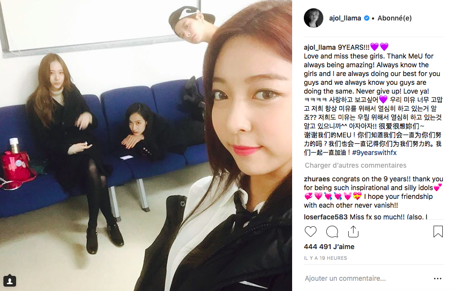 f(x) : “Joyeux 9ème anniversaire aux f(x) ! Nous sommes toujours reconnaissantes et nous vous aimons.”
